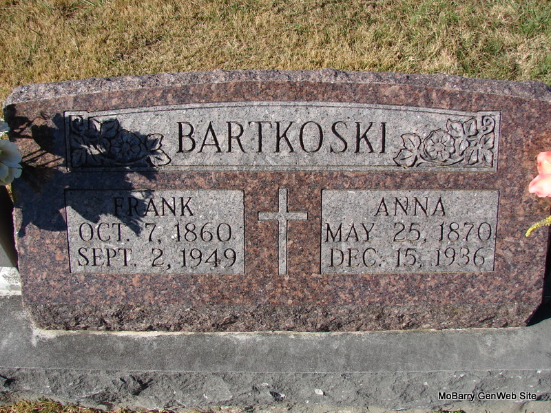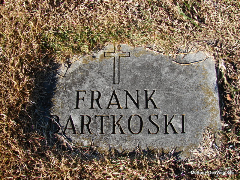 SSW: Frances - Research Note: The stone has his birth year as 1886. The death certificate for Frank F. Bartkowski reads that he was born Jan. 28, 1890 in MO. He was a son of Frank Bartkowski and Anna Ciesielski. He was the husband of Frances Zebert. - Notes for Frank F. Bartkowski | Death Certificate MO Marriage Records Census Notes Phyllis Long Dates from Book-Past & Present Frank Hatton Photo Jim Pierce |