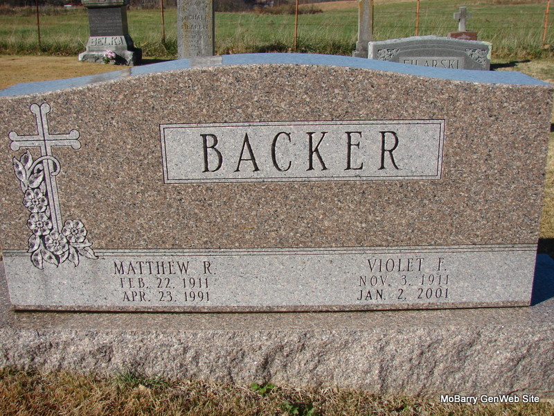 | BACKER, Matthew R. | Feb. 22, 1911 | Apr. 23, 1991 | SSW: Violet F. - Research Note: Son of Matthew Backer Sr. and Mary Filarski. Husband of Violet Florence Beckman. Notes for Matthew Backer | Census Notes Phyllis Long Dates from Book-Past & Present Frank Hatton Photo Jim Pierce |