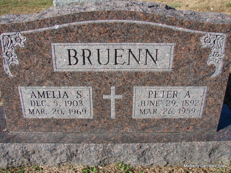 1930 Census Missouri ; Barry ; Purdy ; District 25 Pete A. Bruenn, head, age 37, married at age 34, born MO abt. 1893, parents born Germany Millie S., wife, age 26, married at age 23, born abt. 1904 MO, father born Germany, mother MO |