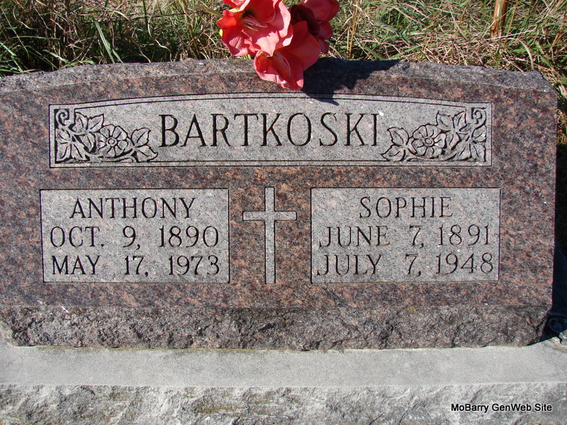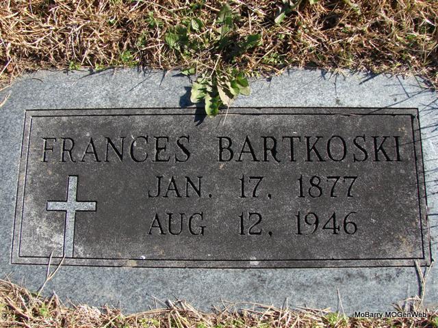 SSW: Frank - Research Note: Frances Zebert married Frank Bartkoski on Oct. 26, 1910 in Bricefield, Barry Co., MO. Daughter of Antoni and Aniela Zebert, both buried in this cemetery. - Notes for Frances Bartkoski | Census MO Marriage Records Notes Phyllis Long Dates from Book-Past & Present Frank Hatton Photo Jim Pierce |