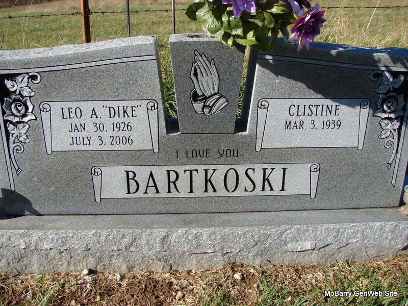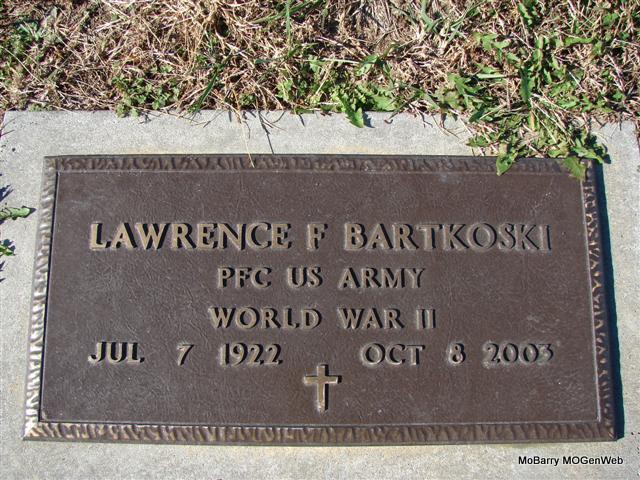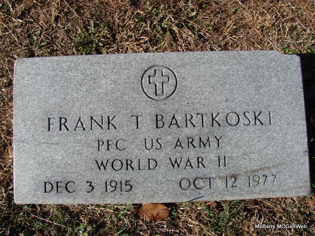 Oct. 12, 1977 | Research Note: WW II Draft Card: Living in Wheaton, MO. Registered on Oct. 16, 1940. Employed by Marvin McCullah. Wife given as Christine Bartkoski. His second wife was Emma Faye (Laney) (Utter) Bartkoski. - Military Stone - Inscription: "PFC US ARMY - WORLD WAR II" | WW II Draft Card Census Phyllis Long Photos Jim Pierce |