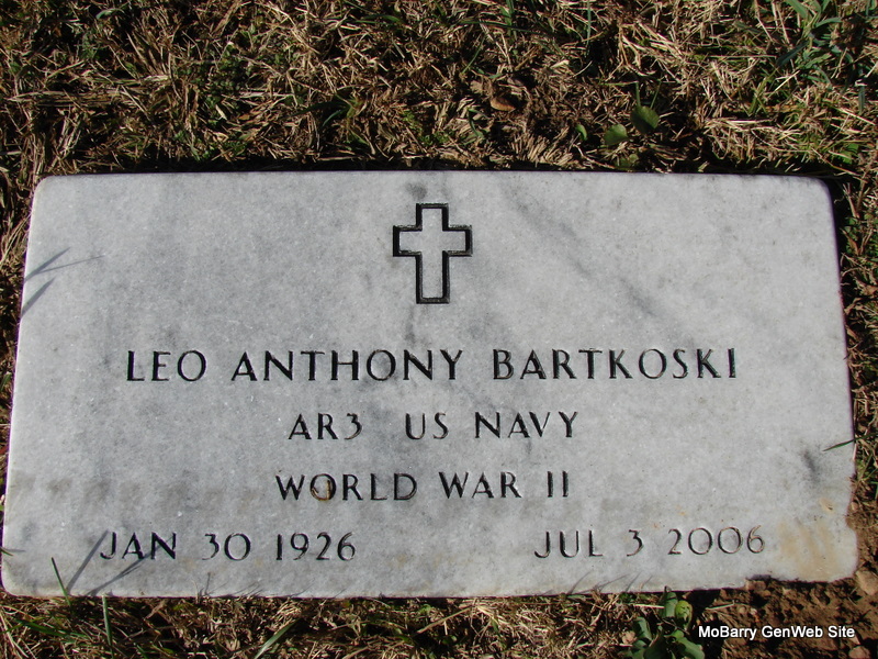 Military Stone Inscription: "PFC US ARMY - WORLD WAR II - KOREA" - Research Note: Son of Anthony Bartkoski and Sophie Rose Wrobleski. - The obit reads that he was born in 1927, but the stone reads 1928. Army veteran of the Korean Conflict. Donna's Post: Billy Norman Bartkoski, age 73, of Kansas City, formerly of Purdy, died at 6:30 p.m. December 17 at Liberty Hospital in Liberty. He was born September 28, 1927, in Purdy. He was an Army veteran of the Korean conflict and a Catholic. He was preceded in death by his father, Tony Bartkoski. - Notes for Billy Bartkoski | Monett Times Dec. 19, 2000 Mary Homesley Note Donna Cooper SSDI Census Notes Phyllis Long Photo Jim Pierce |