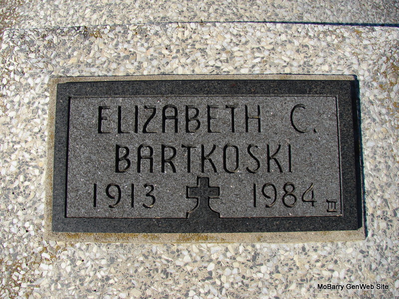 | BARTKOSKI, Elizabeth C. (DOMBROSKI) | Mar. 28, 1913 | Nov. 1984 | Research Note: Daughter of John Vincent Dombroski and Mary Rose Piskulla. - The News-Leader - Mrs Bartkoski died at 4pm, Sunday in her home, after a long illness. A lifelong resident of Pierce City, she was a member of St Mary's Catholic Church. Survivors include her husband, John F., three sons; two brothers, Joe Dombroski, Monett and Dave Dombroski, Springfield; two sisters, Haddie Rosewicz, Pierce City and Mary Flaherty, Monett; eight grandchildren and three great-grandchildren. She is buried next to John F. Bartkoski. - Notes for Elizabeth C. Bartkoski | Wessell Funeral Chapel Census Notes Phyllis Long Dates from Book-Past & Present Frank Hatton Photo Jim Pierce |