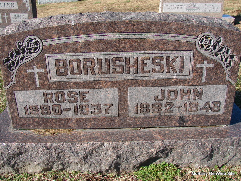SSW: Rose - Research Note: John's stone has that he was born in 1882, which is probably incorrect. The death certificate for John Borusheski reads that he was born Dec. 28, 1873 in Boguszyn, Poland, and died on Mar. 19, 1948 in Exeter, Barry Co., MO. His usual residence was Purdy, Barry Co., MO. He was widowed, wife's name was Rosa. He was a farmer and a son of Frank and Catherine Borusheski. Ed Borusheski of Purdy, MO was the informant. Coronary thrombosis was the cause of death. - Notes for John Borusheski | Death Certificate Census Notes Phyllis Long Dates from Book-Past & Present Frank Hatton Photo Jim Pierce |