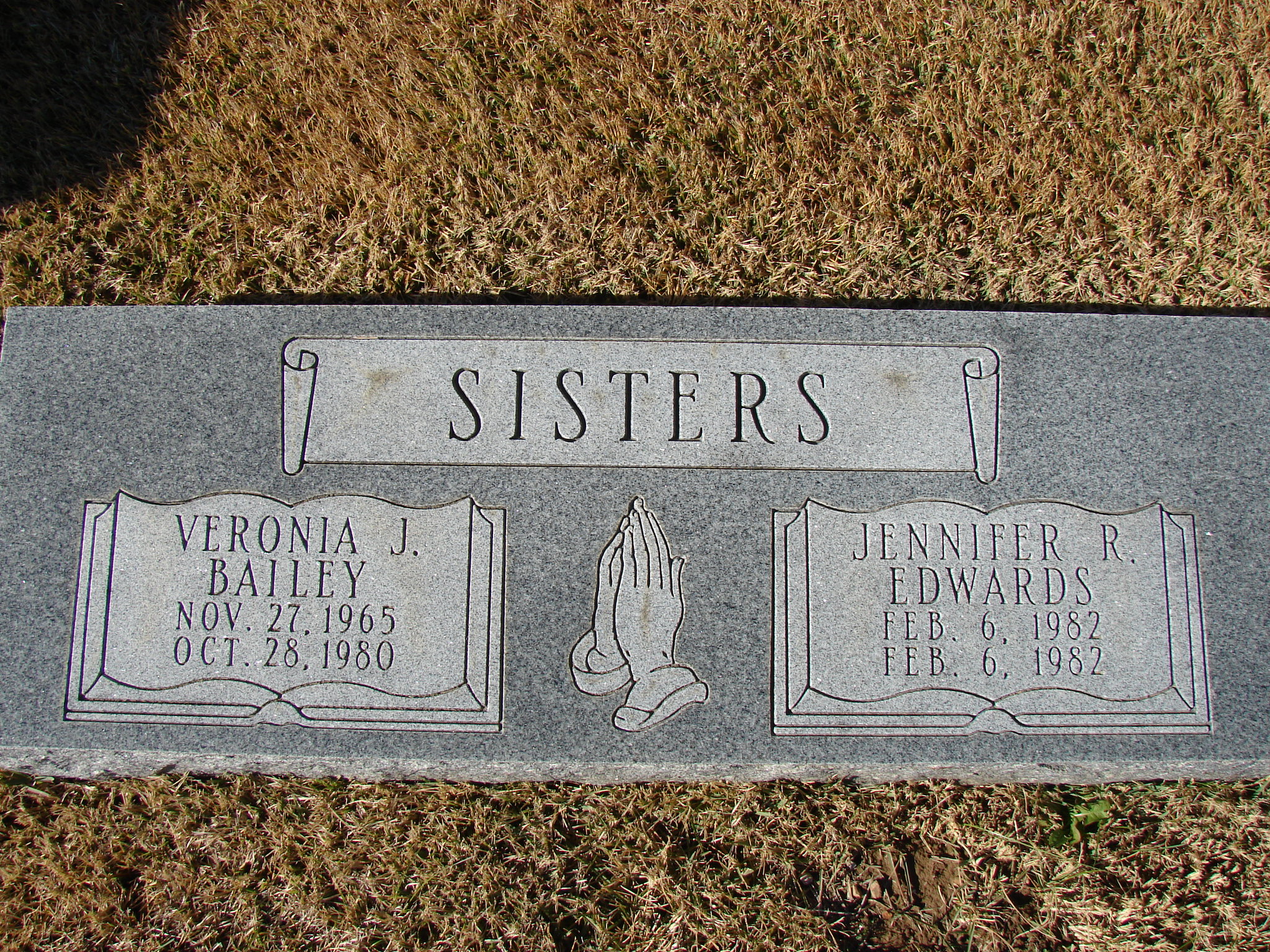 | BAILEY, Veronica J. | Nov. 27, 1965 | Oct. 28, 1980 | SSW: Jennifer R. Edwards - Inscription: "Sisters" - Research Note: Notes for Veronica J. Bailey | SSDI Notes Phyllis Long Dates from Book-Past & Present Frank Hatton Photo Jim Pierce |