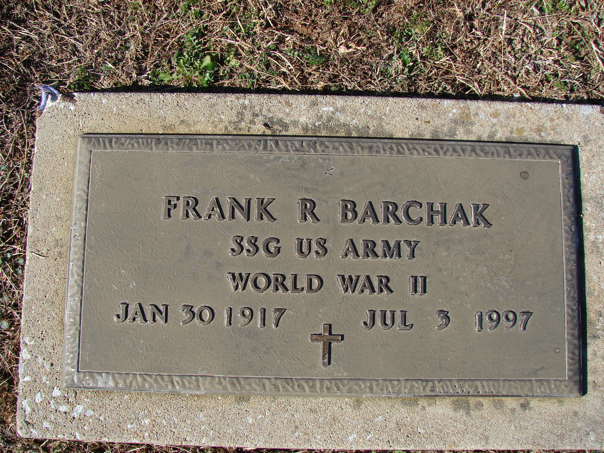 SSW: Dorothy D. Hughes - Inscription: "Married Sept. 12, 1946" - Research Note: Francis Raymond "Frank" Barchak was a son of Joseph B. Barchak and Anna (Bartkoski) Barchak. - Mr. Barchak was born in rural Pierce City, MO. He had lived in Wentworth for 50 years. He was the owner of Barchak Welding, Wentworth, until his retirement. He was an Army veteran of WW II who served in the 203rd Coast Artillery in the Aleutian Islands. He was a member of St. Mary's Catholic Church, Knights of Columbus Post No. 7130, Pierce City, and the Pierce City American Legion. He married Dorothy Hughes on Sept. 12, 1946 in Joplin, MO. Survivors include three sons, Frank Jr. and Joe, both of Wentworth, and Jim of rural Monett, MO; two daughters, Christy Tu, Joplin, and Janice Blinzer, Webb City; a brother Mike of Wentworth; 15 grandchildren; and two great grandchildren. - Military Stone - Inscription: "SGT US ARMY - WORLD WAR II" - Notes for Francis Barchak | Census SSDI Obit Notes Phyllis Long Dates from Book-Past & Present Frank Hatton Photos Jim Pierce |