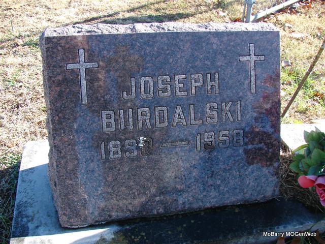 Research Note: The stone has 1890 inscribed on it. Frank Hatton's cemetery file reads: Burdalski Joseph - 0/0/1890 - 0/0/1958 - Death certificate files have his birth year different and the census has yet another year. On the death certificate he is listed as Joseph Burdolski, born Dec. 7, 1889, MO and died Dec. 26, 1958, St. Vincent Hosp., Monett, Barry Co., MO. He was a farmer and his wife's name was Frona Vonslevitz. He was widowed twice. He was a son of John Burdolski and Dorthy Boursheski. Amelia Burdolski Dody (daughter) of Purdy, MO was the informant. - Notes for Joseph Burdolski |