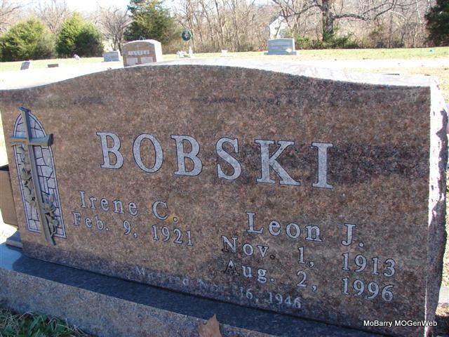 SSW: Leon J. - Inscription: "Married Nov. 16, 1946" - Mrs. Irene Clara (Golubski) Bobski, age 89, of Purdy, MO, passed away on Monday, Nov. 22, 2010 at her home. Irene was born on Feb. 9, 1921 in Purdy to Joseph and Clara (Jaster) Golubski. She was united in marriage to Leon John Bobski on Nov. 16, 1946 in Pulaskifield, MO. Irene was a homemaker and a member of Sts. Peter and Paul Catholic Church and the Ladies Altar Society. Irene is survived by one son; two daughters; one brother; two sisters; eight grandchildren, seven great-grandchildren, seven step-grandchildren and 2 step-great-grandchildren. Irene was preceded in death by her husband in August of 1996. Services will be held at 10 a.m. at Sts. Peter and Paul Catholic Church. Burial will follow at Sts. Peter and Paul Cemetery in Pulaskifield, MO. - Notes for Irene Bobski | Census Monett Times Notes Phyllis Long Photo Jim Pierce |