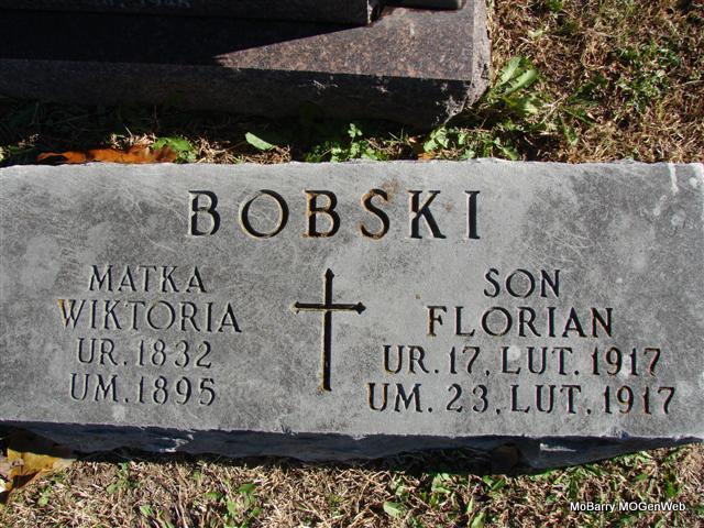 SSW: Florian - Son - Research Note: Wiktoria / Victoria Bobski was born in 1832 in Poland and died in 1895 in MO. On Rootsweb, Tyne Firmin posted that Victoria was the wife of John Bobski and the mother of Joseph, born 1861, and Florian Bobski. | Notes Phyllis Long Dates from Book-Past & Present Frank Hatton Photo Jim Pierce |