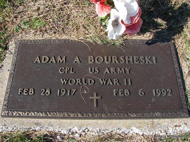 Feb. 6, 1992 | SSW: Willodene - He was the son of Stanislaus / Stanley Boursheski and Josephine Stipp. His wife was Willodene Henbest. - Military Stone Inscription: "CPL US ARMY - WORLD WAR II" - Notes for Adam Boursheski | Photo Jim Pierce Census Notes Phyllis Long |