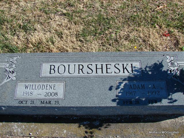 SSW: Adam A. - Research Note: She was the daughter of William Henbest and Ocie Ball. Her husband was Adam A. Boursheski whom she married May 21, 1944. - Willodene Boursheski, 89, of Pierce City, died on Sunday, March 23, 2008, at Cox Monett Hospital. Mrs. Boursheski was born on Oct. 21, 1918, in Cassville, Mo., a daughter of the late William and Ocie (Ball) Henbest. She was a graduate of Butterfield High School and worked in Wichita, Kan., during World War II. She was married to the late Adam Boursheski on May 21, 1944. She was a member of the Sts. Peter and Paul Catholic Church in Pulaskifield, the Altar Society and the Barry County Election Board. Survivors include two daughters; one son; two granddaughters; five grandsons; and two great-grandsons. Additional survivors include one brother; one sister; and many nieces and nephews. She was preceded in death by three brothers, Homer, Clifford and Roger Henbest; and three sisters, Ruby Homesley, Imogene Boyd and Thelma Nickle. Funeral Mass will be held at Sts. Peter and Paul Catholic Church in Pulaskifield. Burial will be in the church cemetery. | Photo Jim Pierce Obit Notes Phyllis Long |