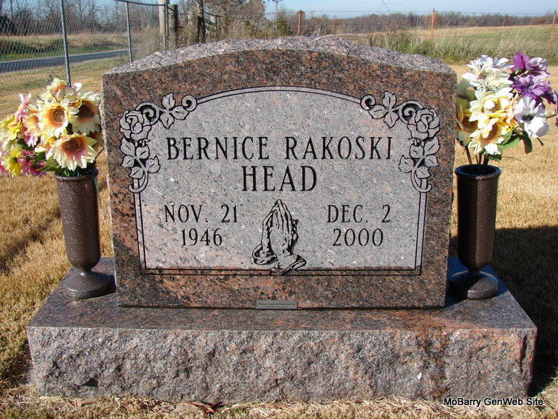 | HEAD, Bernice Margie (RAKOSKI) | Nov. 21, 1946 | Dec. 2, 2000 | Research Note: Daughter of Walter Rakoski and Clara W. Stipp. Bernice Margie Rakoski, age 23, married Garry Wayne Head, age 24, on Jan. 7, 1970 in Joplin, Jasper Co., MO. | MO Marriage Records Phyllis Long Photo Jim Pierce |