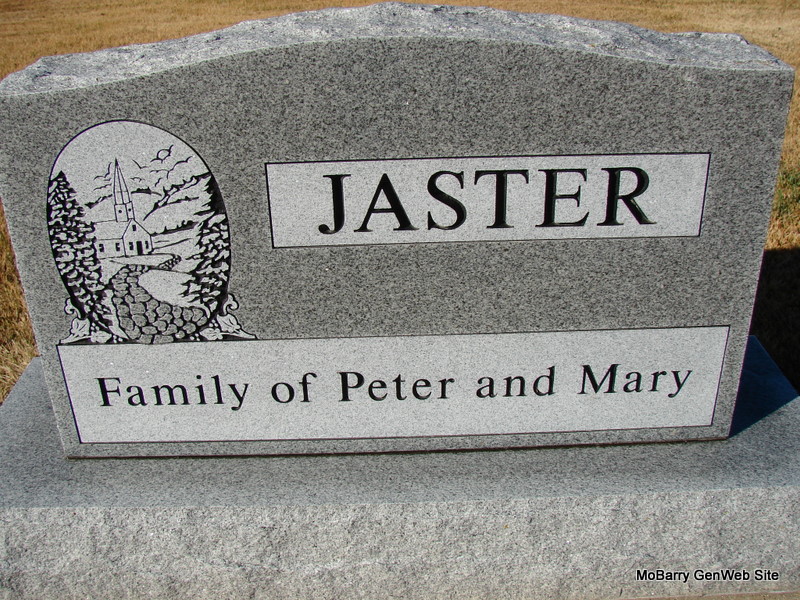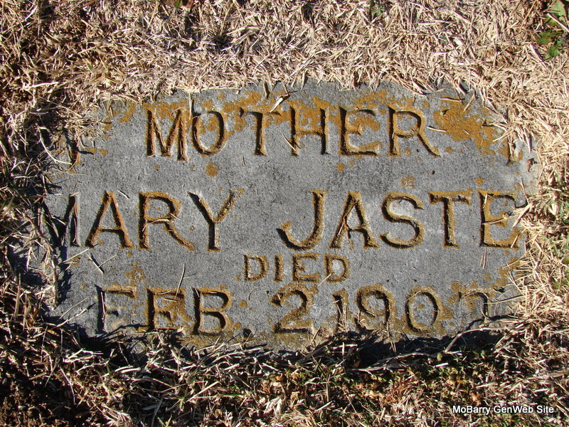 Inscription: "Mother" - Research Note: Mary Staponski married Peter Jaster on Feb. 22, 1882 in Lawrence Co., MO. Daughter of Antone Staponski and Mary Darkoski. - Main Stone reads: Family of Peter and Mary Jaster | Census MO Marriage Records Notes Phyllis Long Dates from Book-Past & Present Frank Hatton Photos Jim Pierce |