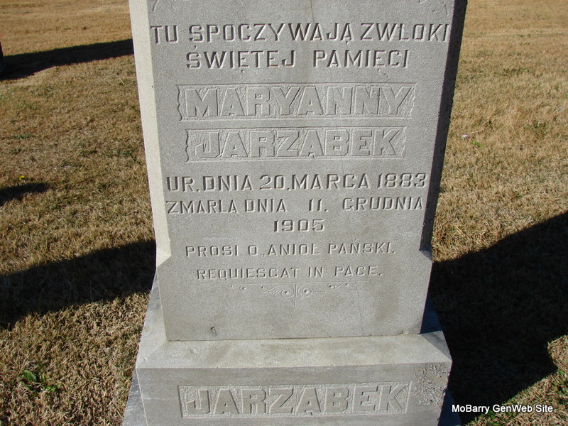 | JARZABEK, Maryanny (CENDROSKI) | Mar. 20, 1883 | Dec. 11, 1905 | Research Note: Her stone is inscribed in Polish. Photo at findagrave.com. Frank Hattons' notes read: Jarzabek, Maryanny CENDROSKI - 3/20/1883 - 12/11/1905 - Daughter of Michal Cendrowski and Marja Jablonski both buried at St. Peter and Paul cemetery. Her husband was Frank. - MO Marriage Records: Jarzembek, Frank (24) Cendrowska, Mary (20) Feb. 5, 1903 - | MO Marriage Records Notes Phyllis Long Dates from Book-Past & Present Frank Hatton Photo Jim Pierce |