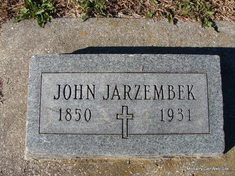 Research Note: Death certificate is indexed and spelled Jerzembeck and has a different birth year than his stone has. Stone has born 1850 and death certificate has 1855. He was married and a farmer. He was a son of Walter Jarzembeck and Cathrine Cosper, both born Poland. John Jerzembeck of Pierce City, MO was the informant. - Notes for John Jarzembek | Note Donna Cooper Death Certificate Census Notes Phyllis Long Book-Past & Present Frank Hatton Photo Jim Pierce |