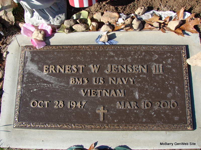 Military Inscription: "BM3 US NAVY - VIETNAM" - Mar. 9, 2010 - One week later the search continues for Ernest Jensen, 62, of Stark City. The Eastern Newton County veteran is still missing. Jensen, described as white male, resides on Vixen Road, which is located off of U.S. 60. He was last seen around 3:30 a.m. Wednesday, March 3. Apparently, he walked off into the woods. "He has done this before, I believe that it was twice before, but he has come home before," said the Sherrif's Deputy in last week's article. "But I think that this is the longest that he has been gone this time. Apparently, he suffers from post traumatic stress, he says, from Vietnam." - March 11, 2010 - Missing man's body found: The body of missing Ernest Jensen, a 62-year-old Vietnam War veteran, was found late Wednesday night. "About 8:30 p.m. Wednesday, a lady called the sheriff's office, she discovered the body lying under a bunch of thickets and brush, near a water tank and a horse trough for her horses," said the Newton County Sheriff. "This is three-quarters to a mile west of where he lived. We do not know when he got there. We don't know if he was trying to make his way back home or what the situation was. Right now, there are no physical signs of anything, we are going to assume it was exposure or something like that, but just to make sure, we will conduct an autopsy today." Jensen was last seen around 3:30 a.m. Wednesday, March 3, at his home on Vixen Road, which is located right off of U.S. 60 in eastern Newton County. His wife reported him missing. This was not the first time that Jensen had left, but he had always come back. "As of yesterday, we have been talking to his wife and she was thinking that maybe he had made it down to Fayetteville, Ark., veterans hospital," the Newton County Sheriff said. "This is certainly not the outcome that we had hoped and prayed for. We certainly feel badly for his wife." | Photo Jim Pierce News Items Phyllis Long |