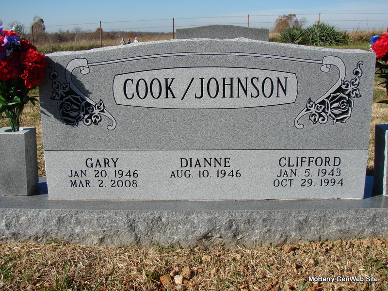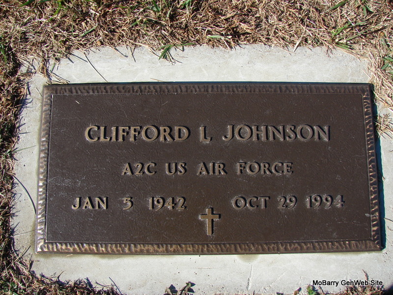 Oct. 29, 1994 | SSW: Cook/Johnson - Gary and Dianne Cook - Research Note: The Military Stone has the birth year as 1942. - Possible wife: Clifford L. Johnson, age 43, divorced Judy C. Johnson, age 40 on Dec. 9, 1986 in Matagorda, TX. They were married on May 15, 1976. - SSDI Name: Clifford L. Johnson SSN: 350-34-4704 - Last Residence: 72701 Fayetteville, Washington, Arkansas - Born: 5 Jan. 1943 - Died: 29 Oct 1994 - State (Year) SSN issued: Illinois (1958-1960) - Military Stone - Inscription: "A2Z US AIR FORCE" |
