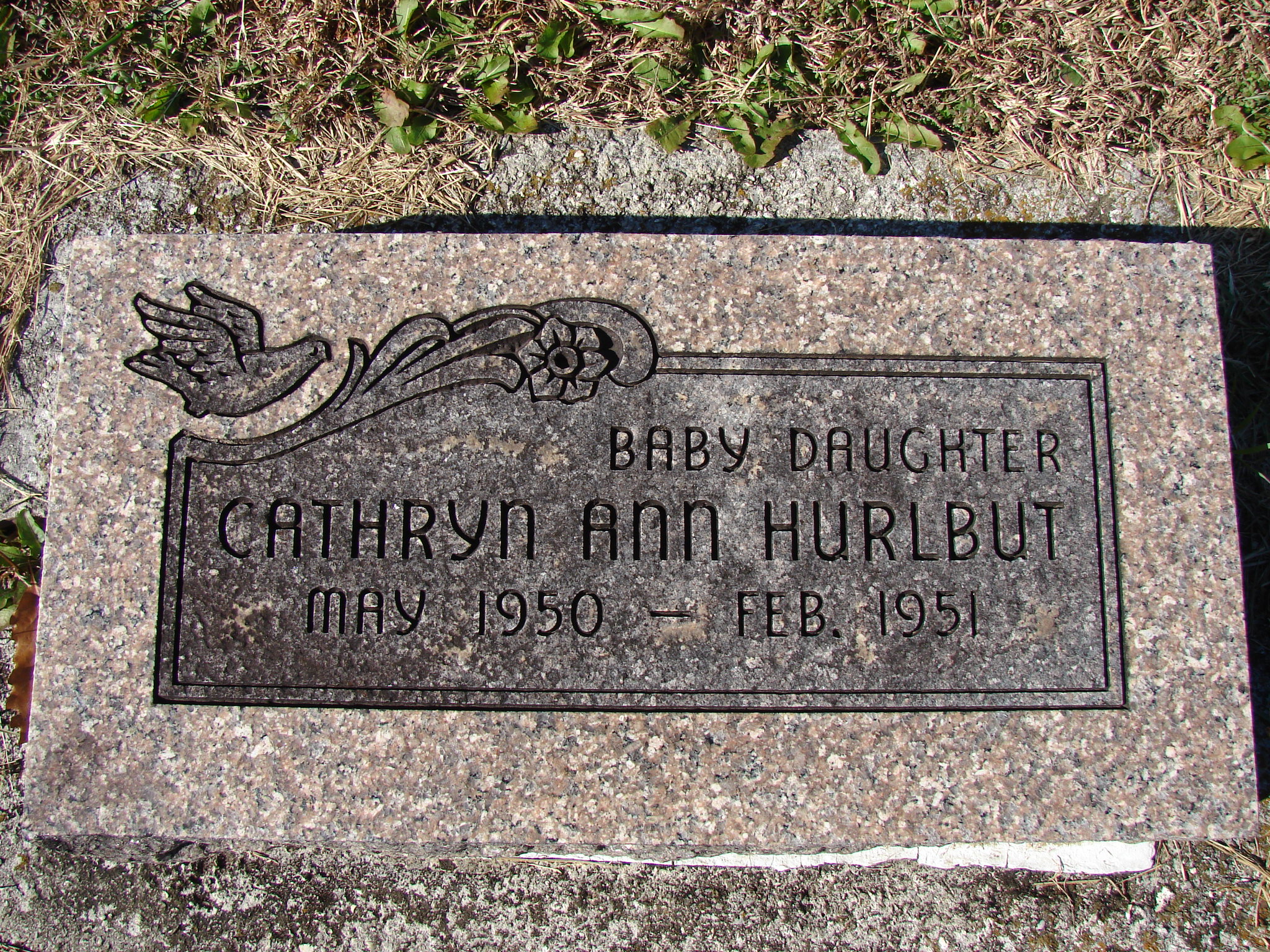 Inscription: "Baby Daughter" - Research Note: She was a daughter of Clifford Ray Hurlbut and Loretta (Dombroski) Hurlbut. - The Wheaton Journal - Wheaton, Missouri · Thursday, February 15, 1951 - Pioneer Community - We extend sympathy to Mr. and Mrs. Clifford Hurlbut in the death of their little 8 month old daughter who passed away ina Wichita, KS hospital Tuesday of last week. Burial was made in the Pulaskifield cemetery Friday morning. Mrs. Hurlbut is the former Miss Loretta Dombroski. | Photo Jim Pierce Note Wheaton Journal Phyllis Long |