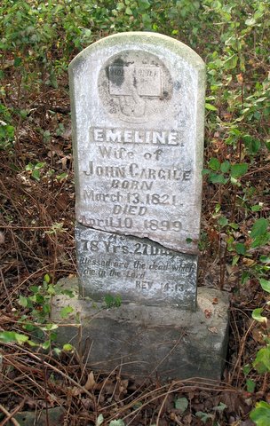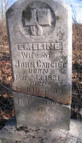 Inscription: "Wife of John Cargile" - Research Note: She was the daughter of Thomas Eubank and Nancy Old. John married Emeline E. Eubank, daughter of Thomas Eubank and Nancy Old, maybe Aug. 6, 1840, Barry Co., Missouri. I say "maybe" because there seems to be a lot of controversy on the subject. Some researchers report that Emeline first married William Lane. The first child born to John and Emeline was 6 Oct 1841. I wouldn't think that they would have waited until approximately 5 weeks before the birth of their first born to get married. Of course, not being there, one does not know the circumstances. At any rate, the following record can be found on the Barry Co., genweb site. Take note that John had a brother named Isaac who married Evaline Cunningham. Could be their marriage record. - EARLY BARRY COUNTY MARRIAGES, LANE, EVALINE and CARGILE, J. N. - Aug. 6, 1840, State of Missouri, Barry County. I, Joseph E. Miller a Minister of the Gospel of the Methodist Protestant Church do certify that on the 6th day of August A.D. 1840, I did solemnize the rites of Matrimony between John Cargile and Evaline Lane all of Barry County. Sworn under my hand this 24th day of August 1840, Joseph E. Miller, MGMPC. The above marriage certificate was filed in office and entered upon record the 26th day of August, AD 1840, Saml. M. Phariss, Clerk. - Emeline was living with her daughter Eliza Ann and husband Thomas Weathers at age 62 after the death of John. - 1880 Sugar Creek Twp., Barry Co., MO - Thos. Wethers (Weathers), Self, Married, age 23, Born MO, Farmer, father born TN, mother born TN; Annie Wethers, Wife, Married, age 19, born MO, Keeping House, father born TN, mother VA; Emaline Cargile, Mother-in-Law, Widowed, age 62, born VA, Keeping House, parents born VA. - Broken Stone - Another Photo | Note Photo Phyllis Long Photo Donna Cooper Darla Ball Marbut |