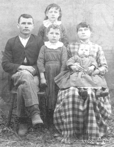 Pictured front row, from left are: Hezekiah, Eller, and Margaret holding Lena. Minnie is standing behind. The photograph is circa 1888-1889. Hezekiah Harbert was born April 1860 in Missouri the son of Mathew Harbert and Elender ?. He married (1) Margaret Frances Clanton October 23, 1879 in Barry County, Missouri. She was born April 03, 1861 in Arkansas the daughter of Edward Clanton and Martha C. Dodson. It is unknown where Hezekiah and Margaret are buried. Mathew, Elender and Martha are all buried in Viney Creek Cemetery, Edward is buried in Horner Cemetery. Minnie May Harbert was born November 10, 1880 in Missouri, and died November 17, 1959 in Commerce, Oklahoma. She married Charley Smith January 24, 1897 in Barry County, Missouri, son of Jasper Smith and Cynthia Tucker. He was born August 15, 1877 in Baxter Springs, Kansas, and died January 12, 1957 in Exeter, Barry County, Missouri. (Both Minnie and Charley are buried in Maplewood Cemetery. Jasper and Cynthia are buried in Munsey Cemetery) Eller Harbert was born October 1882. She married Mr. Rohland. Lena Harbert was born November 1887. Submitted in 2005 by Norman Smith |