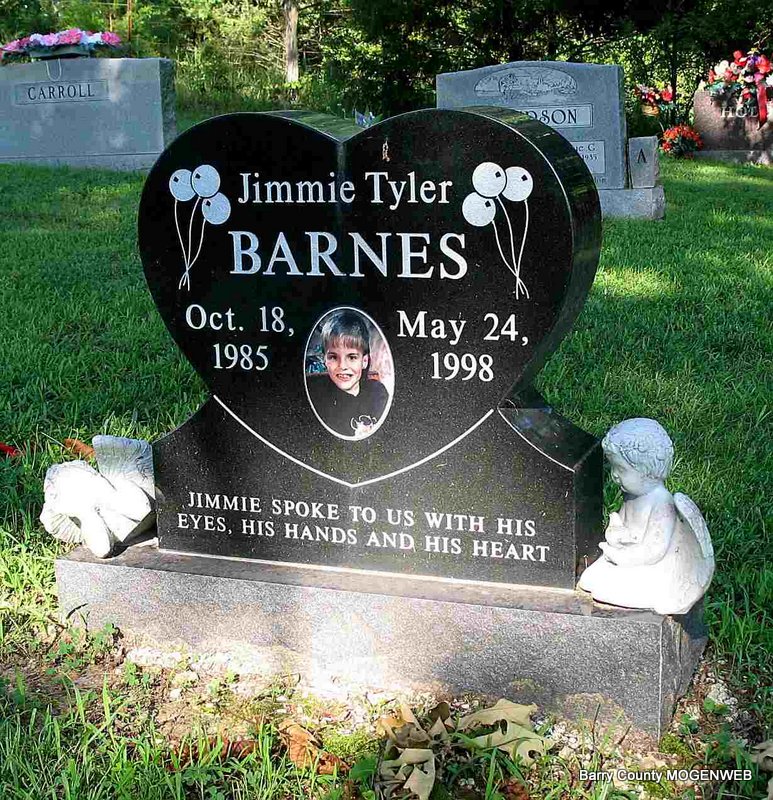 | BARNES, Jimmie Tyler | Oct. 18, 1985 | May 24, 1998 | Inscription: "Jimmie Spoke to us with his Eyes, His Hands and His Heart" | Headstone Darla Ball Marbut Photo Jack Fly |