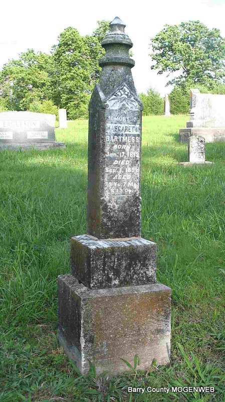 SSW: Eliza Ellen - Research Note: Son of George and Margaret (Shook) Bartmess. - Cassville Democrat, March 22, 1934 - William Joseph Bartmess was born in Illinois, December 25, 1848. He died at the home of his daughter, Mrs. Carrie McCandless, south of Cassville, on March 16, 1934, at the age of eight-five years, two months and twenty-one days. He was united in marriage to Eliza Ellen Rardin, on March 9, 1871. To this union eight children were born. Three of the children and his wife preceded him in death. Those living are Johnnie of Boise, Idaho; Joe of Golden, MO; Mrs. Minnie Wallace and Cora Wolfinbarger of Ontario, Calif., and Mrs. Carrie McCandless of Cassville. He had made his home with Mrs. McCandless for the past several years. Beside the children living, he is survived by a number of grandchildren and other relatives and friends. Funeral services were at ten o'clock Saturday morning, March 17 at the Horine Funeral Home in Cassville, by Chas. Vanzandt. Burial was in the Viney cemetery near Golden, under the direction of Horine-Culver Funeral Service. This excellent character had lived a great part of his life in this county and was a man whose word was his bond and had many friends. He lived in the Golden country many years coming to his splendid daughter's home after the passing of his good wife. "Uncle Bill" as he was familiarly known, was loved by all who knew him. It was the writer's good fortune to have been intimately acquainted with him for many years and well loved and respected him. He was an intimate friend of Charles Ray, deceased editor of this paper, as well as his father, the late Dr. Jim Ray, founder of the Democrat, and had been a subscriber to this paper since it's establishment in 1872. We extend sympathy to the bereaved relatives of this good man. - Cassville Democrat, May 22, 1920 - Golden: Uncle Wm. Bartmess who has been staying with his daughter near Cassville, came home this week. | Headstone Darla Ball Marbut Cassville Democrat Barbara Erwin Online Newspapers Census Phyllis Long Photo Jack Fly |