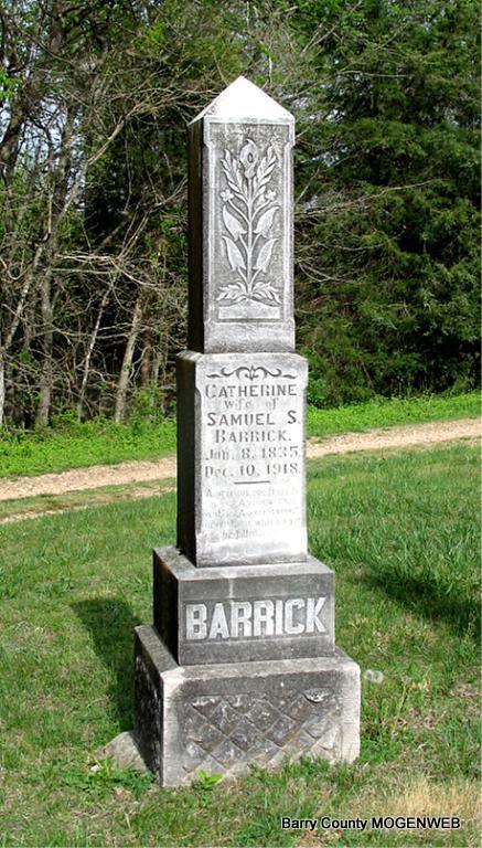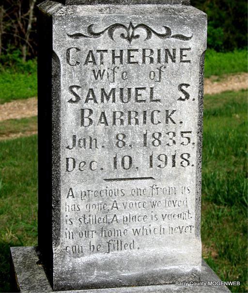 Inscription: "Wife of Samuel S. Barrick" - Research Note: Death Certificate indexed as Kate Barrick. Daughter of George James born VA, mother not known. L. Hill of Shell Knob, MO was the informant. Cause of death: Burned to death in home. Catherine James married Samuel Barrick on Mar. 3, 1866 in Crawford Co., IL. - Cassville Republican, Thursday, Dec. 19, 1918 - Burned To Death: Mrs. Kate Barrick was burned to death in her home near Shell Knob on the night of December 9. Mrs. Barrick was a very old woman. She had lived alone for many years. Old settlers in the eastern part of the county say that she has lived since the Civil War alone in the little house in which she was burned to death. The house had a fire place. It is thought that Mrs. Barrick's clothes caught fire and that she burned to death near the fire place as bones were found near it. The little house and all of its contents were destroyed. During her old age Mrs. Barrick had been cared for by the Hill family who had looked after her as if she were a member of the family. She is said to have been very queer and insisted upon being alone. - Same Paper: Kate Barrick was burned to death in her home on December 9. She lived alone and had for many years. She was very old. Justice of the Peace G. W. Wills summoned a jury and an investigation was made. The jury decided that Mrs. Barrick must have gotten up on the night of the 9th either to build up the fire or to smoke when the fire started which burned her house and herself. Her bones found near the fire place indicated that her clothing caught fire and that she burned to death before the house caught. Mrs. Barrick was a very queer woman. Mr. Hill and son had looked after he during her old age. - Another Photo | Headstone Darla Ball Marbut Death Certificate Online Newspapers IL Marriage Index Phyllis Long Photo Jack Fly |