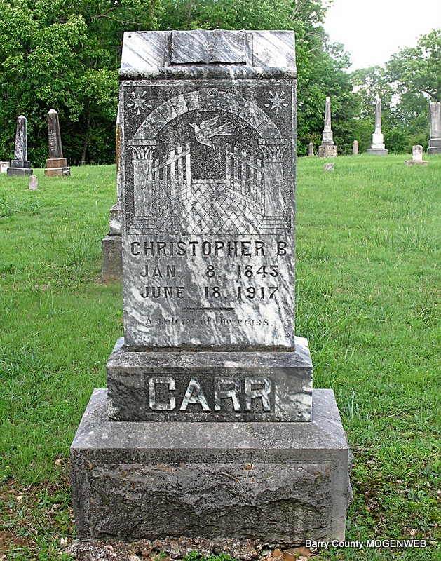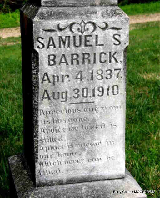 | BARRICK, Samuel S. | Apr. 4, 1837 | Aug. 30, 1910 | Research Note: His wife was Catherine James. - His will is online at ancestry.com. He left one mule, one mare, two cows, two calves to B. F. Hill and his son J. C. Hill, at his death. Also he left 30 acres to B. F. Hill and 80 acres to J. C. Hill after the death of his wife Catherine. She was to pay the taxes. He also left to L. J. Hill, wife of B. F. Hill, one red durham cow. Will was signed on Aug. 29, 1910. Civil War Veteran: Private, Co., D, 38th IL Infantry. Samuel filed for his pension in 1890 and Catherine filed June 14 1912. - September 9, 1910, Thursday, Cassville Republican - Shell Knob News: Samuel Barrick, an old citizen of this locality, died Tuesday, and was buried Wednesday at the Viney Cemetery. - Same Paper - Samuel Barrick of Viola died Monday of last week. He was an aged citizen and had lived in that vicinity for many years. He willed his property to a young man friend who was no relation to him. - Another Photo | IL Veterans CW Pension Records Online Newspapers Phyllis Long Headstone Darla Ball Marbut Photo Jack Fly |