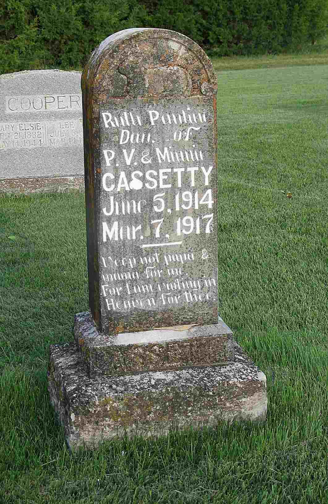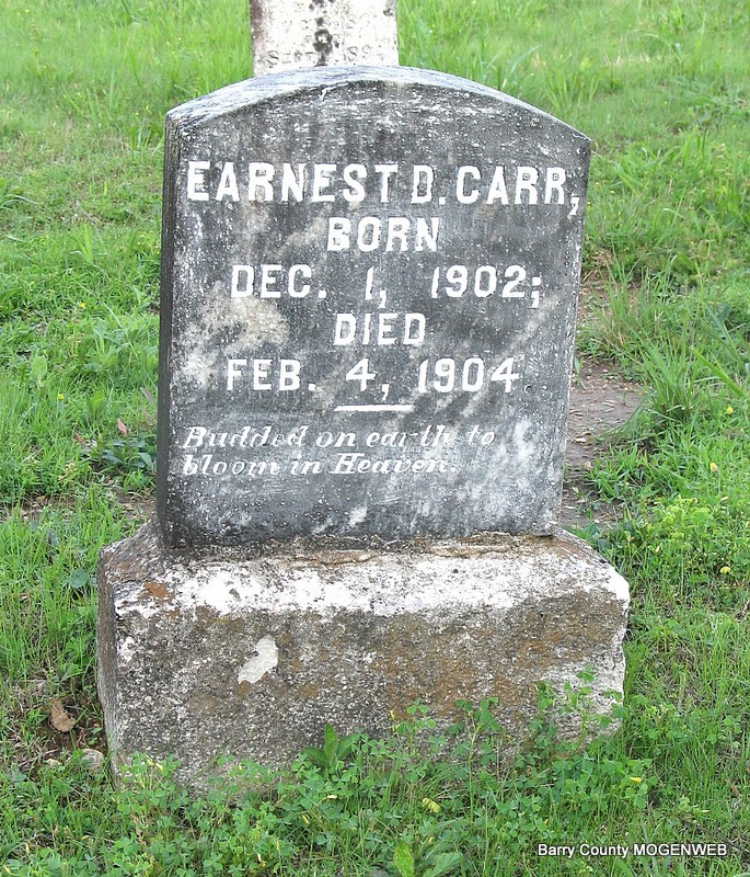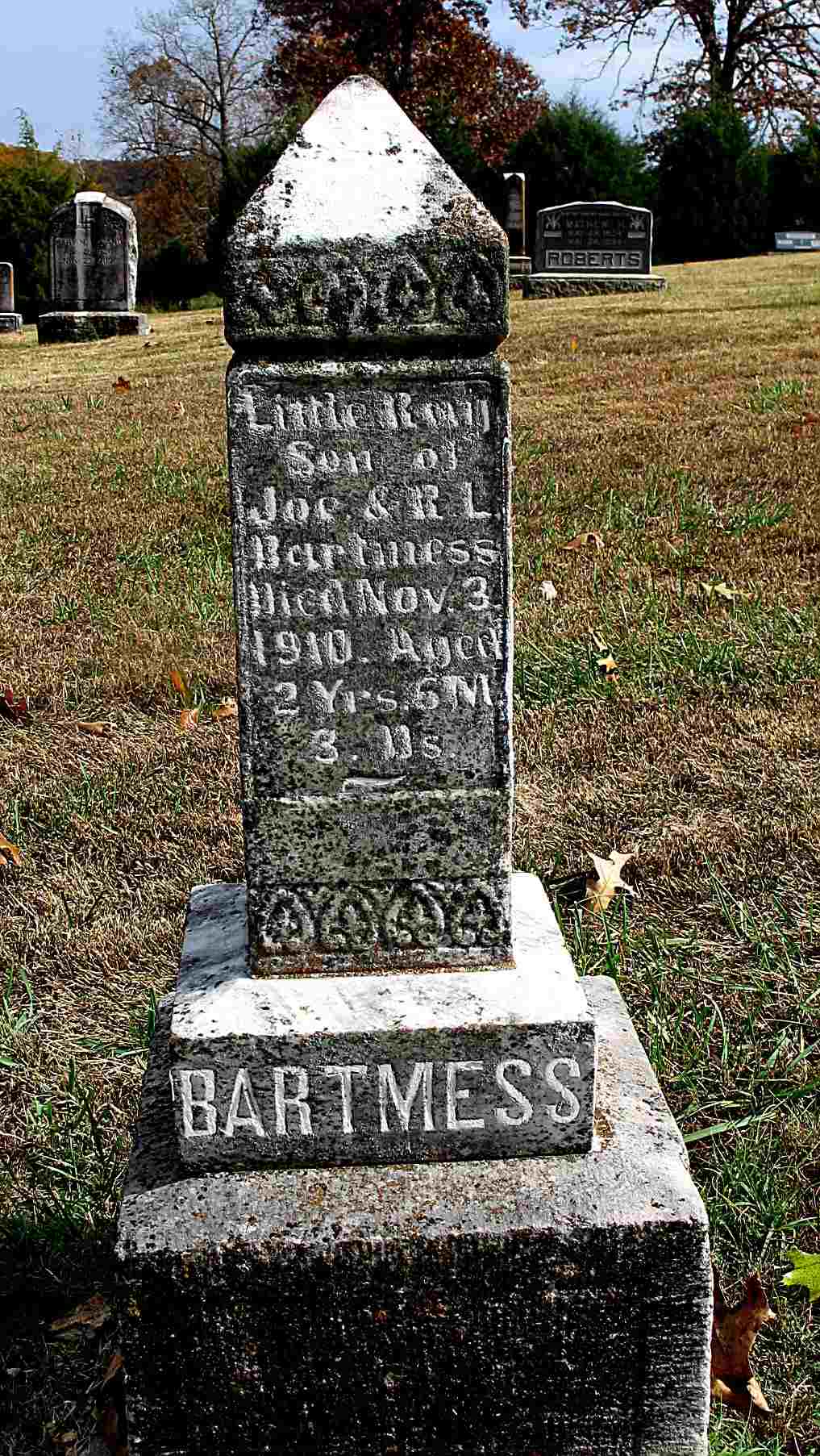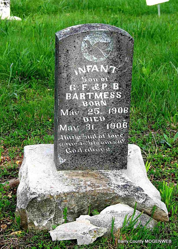 Inscription: "Son of Joe and R. L. Bartmess - Aged 2 yrs 6 ms 3 ds" - Research Note: His parents were Joe Bartmess, born MO and Rachel Hemphill, born MO. Cause of death was meningitis. - Nov. 10, 1910, Thursday, Cassville Republican - Golden: We are sorry to learn of the death of little Ray Bartmess, son of Joe Bartmess, of near Golden. The little one has been sick for 2 months and suffered his last Thursday evening about 4 o'clock. It is hard to give our loved ones up but our loss is Heaven's gain and all we can do is to live for God and do his blessed will so that we can meet our loved ones in the great beyond where they will be no parting with them there. We can sympathize with the dear mother, father and relatives of this dear little babe who has left them and gone to live with God. | Headstone Darla Ball Marbut Photo Jack Fly Death Certificate Online Newspapers Phyllis Long |