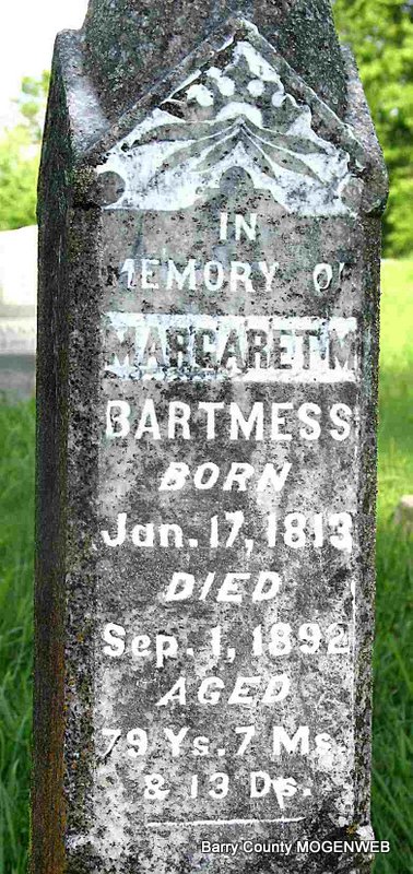 Sept. 1, 1892 | Inscription: "Aged 79 Ys, 7 Ms and 13 Ds" - Research Note: Mother of William Joseph Bartmess. Margaret M. Shook married George Bartmess on Feb. 9, 1831 in Edgar Co., IL. He died in 1866 and is buried at Welsh Ennis Cemetery, Clark Co., IL. Researchers say she was the daughter of William Shook and Rachel Wease. - Another Photo | IL Marriage Index Census Phyllis Long Headstone Darla Ball Marbut Photo Jack Fly |
