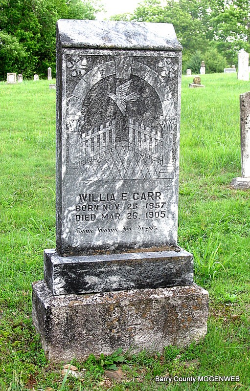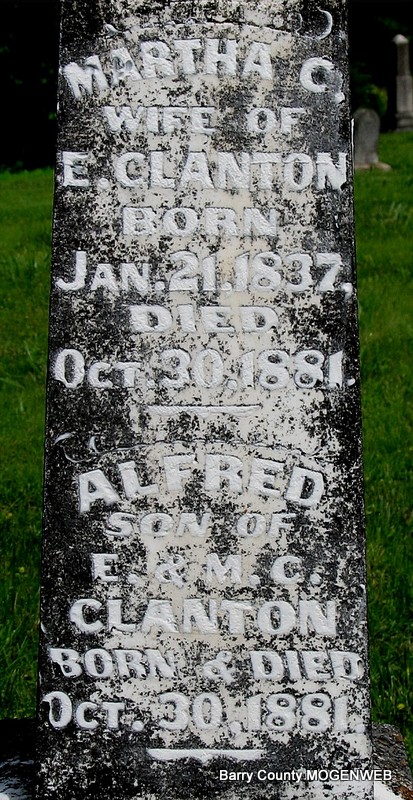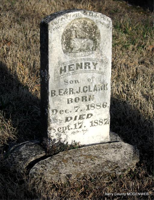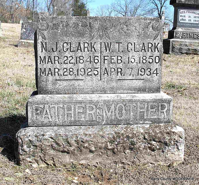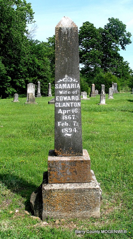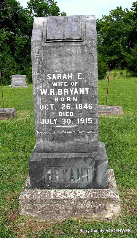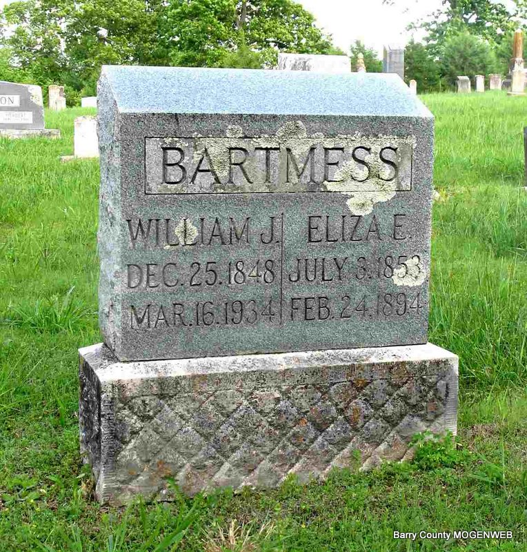 SSW: William J. - Research Note: Daughter of Harvey J. Rardin and Mary Ann Gilkison. William J. Bartmess married Eliza Rardin on Mar. 9, 1871 in Dallas Co., MO. - Cassville Republican, March 1, 1894 - Squire M. H. Roberts of Golden reported Monday the recent death of Mrs. Edward Clanton and Mrs. W. J. Bartmess, Saturday. They were both buried in the Clanton Cemetery, the latter Sunday. | Online Newspapers Census MO Marriage Records Phyllis Long Headstone Darla Ball Marbut Photo Jack Fly |