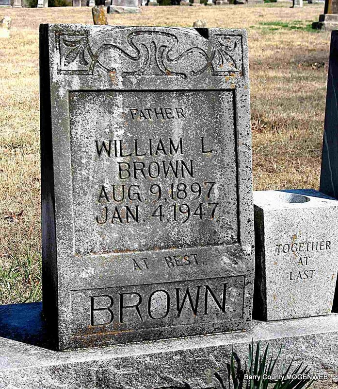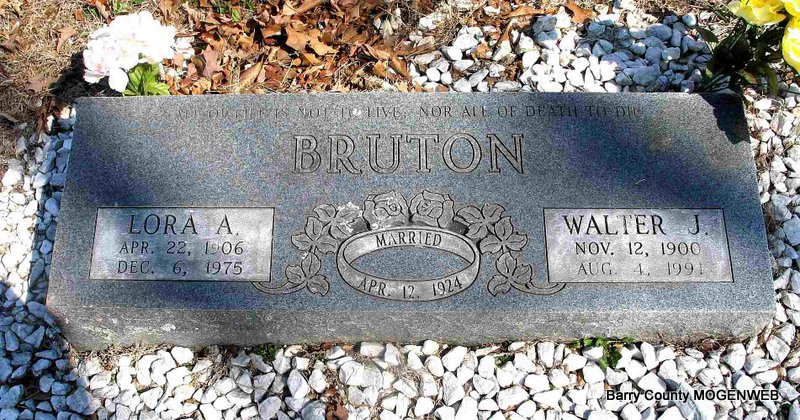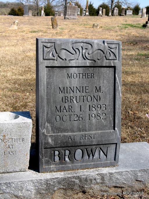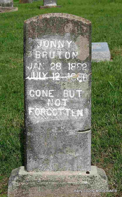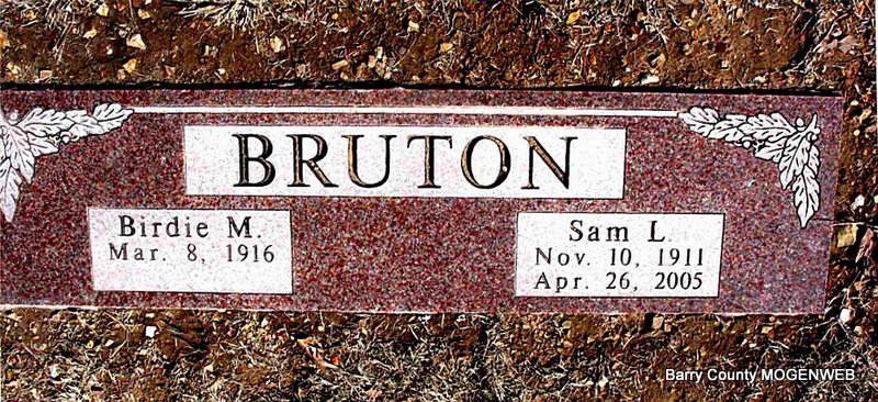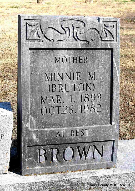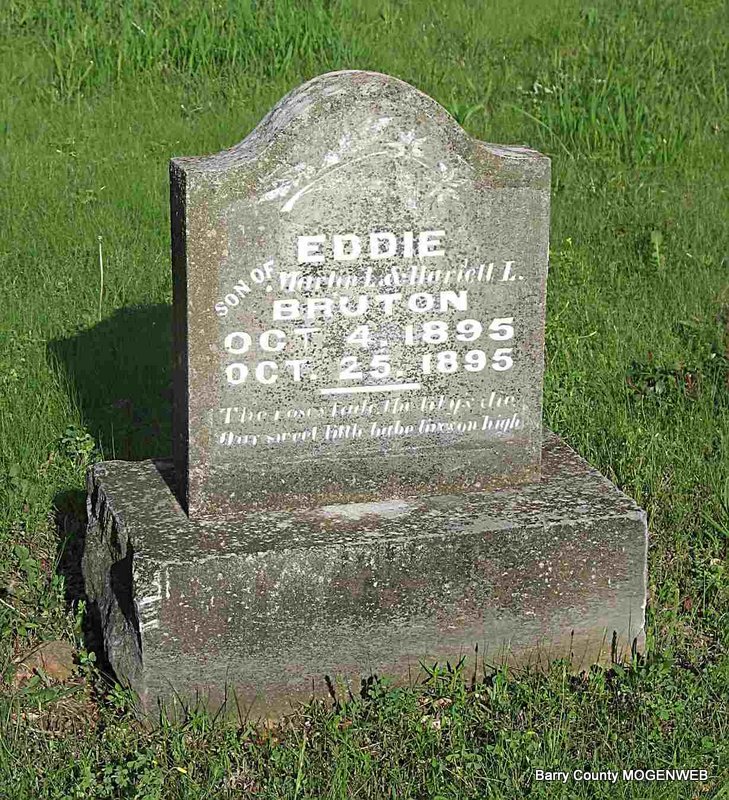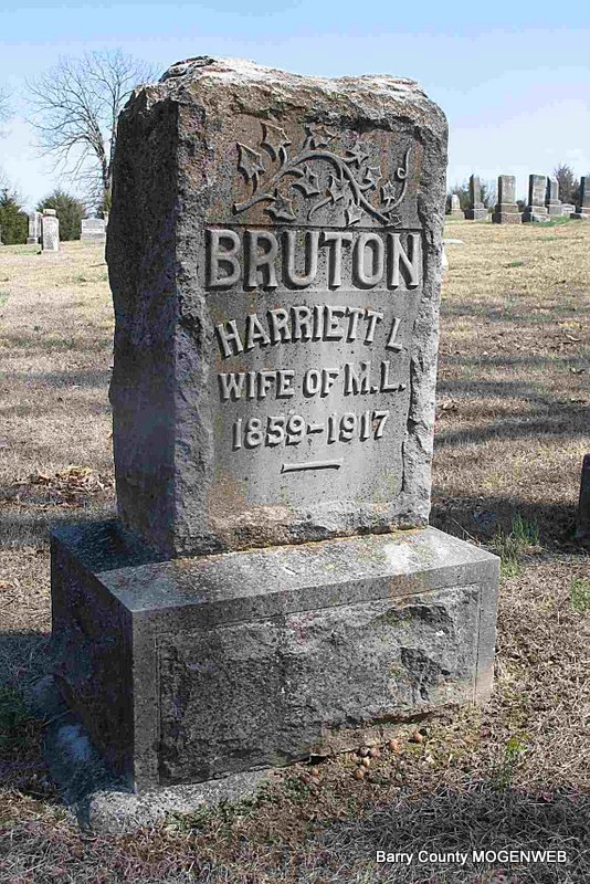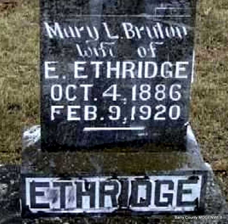 | ETHRIDGE, Mary L. (BRUTON) | Oct. 4, 1886 | Feb. 9, 1920 | Inscription: "Wife of E. Ethridge" - Research Note: Daughter of Martin Luther Bruton and Harriett Lucy Nelson. Wife of William "Edward" Ethridge. He is buried at Oak Hill Cemetery. - William E. Ethridge, age 24, married Mary Bruton, age 29, on June 11, 1905 in Barry Co., MO. William is buried at Oak Hill Cemetery. | Census MO Marriage Records Phyllis Long Photo Darla Ball Marbut |