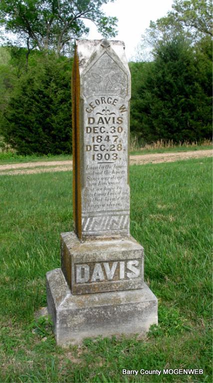 Dec. 28, 1903 | Inscription: "Lonely the house and sad the hours since our dear one has gone. But we hope to meet our loved one on that bright and happy shore." - Research Note: Son of John H. and Martha Davis. George W. Davis married Louisa Elizabeth Hill on Apr. 24, 1873 in Livingston Co., MO. | Census MO Marriage Records Phyllis Long Headstone Darla Ball Marbut Photo Jack Fly |