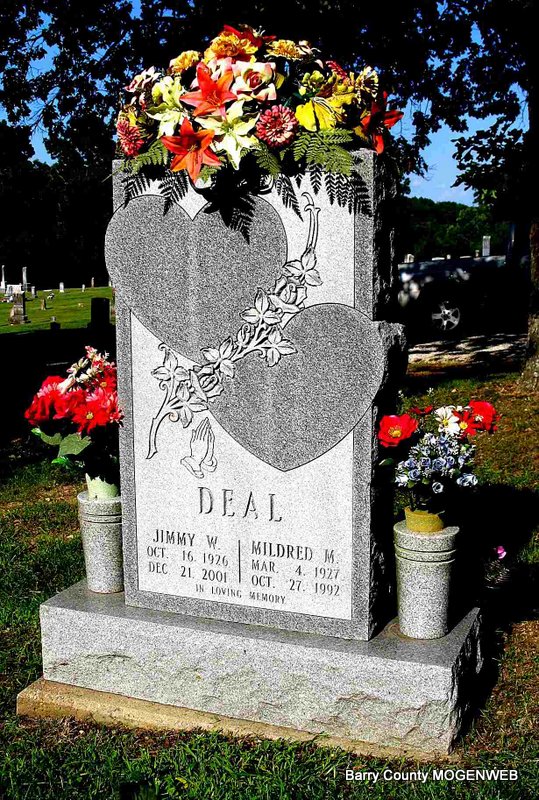 SSW: Mildred M. - Inscription: "In Loving Memory" - Research Note: Son of James Robert Deal and Laura Maybelle Powell. - The Joplin Globe, MO - Tuesday, December 25, 2001 - Cassville, MO - Jimmy W. Deal, 75, passed away Friday, December 21, 2001. He was a retired oil field worker and an Army Veteran. | Joplin Globe Margaret Deal SS Claims Index Phyllis Long Photo Jack Fly |