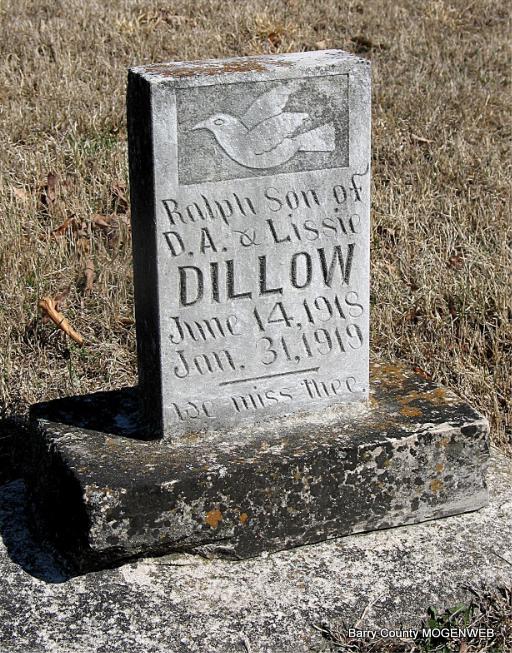 | DILLOW, Ralph | June 14. 1918 | June 31, 1919 | Inscription: "Son of D. A. and Lissie Dillow" - Research Note: Son of David Alpha Dillow and Lissie Mae Russell. - Parent's Obit: October 6, 1953, Enterprise-Courier - Oregon City, Oregon: Lissie Mae Dillow died early Sunday morning at a Tacoma, Washington hospital following a two car accident that claimed the life of her husband, David Alpha Dillow, and her daughter, Tina Venita Jackson. She was born on May 1, 1886 in Green Forest, Arkansas to William Alvin and Frances Emily (Littrell) Russell. Survivors include her daughters, Ethel Marie Pendergraft, Gladys Valo Wright, Jessie Augusta Brady, Maxine Kistner, and Frances Nadine Goins; her sisters, Rosa Ann Porter, Bessie Augusta Standlee, and Oma Ollie Karnes; fourteen grandchildren; and five great-grandchildren. Funeral arrangements are being handled by Holman-Hankins-Rilance Funeral Home and will be announced later. - They are buried at Mountain View Cemetery, Oregon City, Clackamas Co., OR. | Parent's Obit Phyllis Long Headstone Darla Ball Marbut Photo Jack Fly |