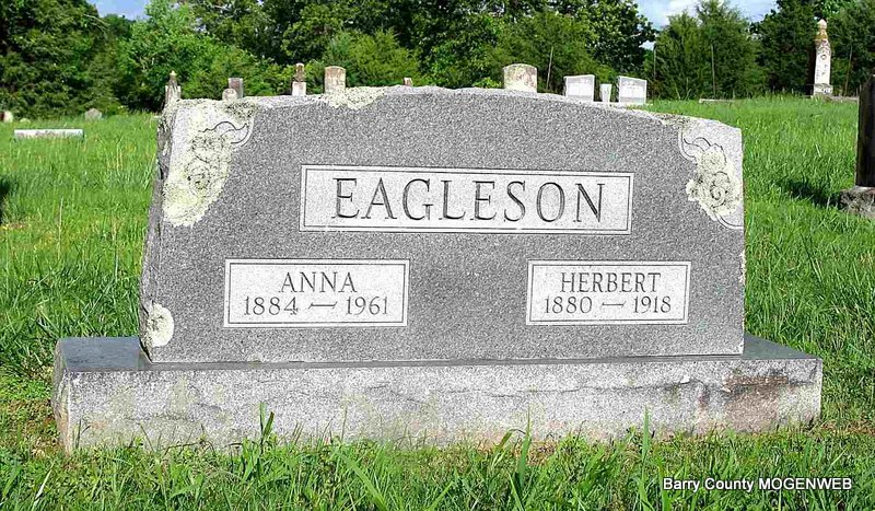 SSW: Herbert - Research Note: Daughter of David Lee and mother not named on the death certificate. Her mother was Sarah Catherine Johnson. Myrtle Easley of Kansas City, MO was the informant on the death certificate. Herbert Eagleson, age 19, married Annie Lee, age 16, on June 25, 1899 in Barry Co., MO. - Another Photo | Death Certificate MO Marriage Records Census Phyllis Long Headstone Darla Ball Marbut Photo Jack Fly |