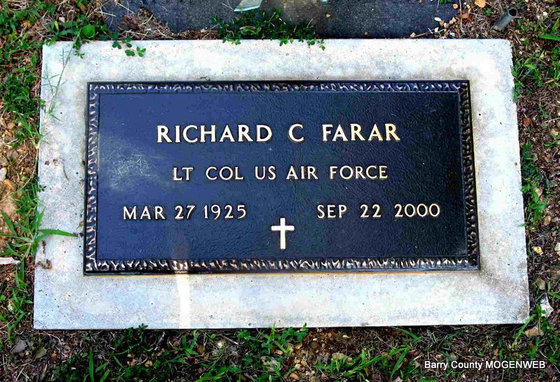 Inscription: "Lt. Col. US Air Force" - Research Note: Son of Dewey and Donne (Nabors) Farar. He served his country with the US Air Force during WW II and later was a Lt. Colonel in the Air Force Reserves. On Sept. 23, 1944 he married Loretta Anna Eckelkamp. Survived by three daughters and two sons, one sister, twelve grandchildren, four great grandchildren. He was preceded in death by his parents and three brothers, Marvin, Hugh, and Clark Farar. | Nelson Funeral Home Phyllis Long Headstone Darla Ball Marbut Photo Jack Fly |