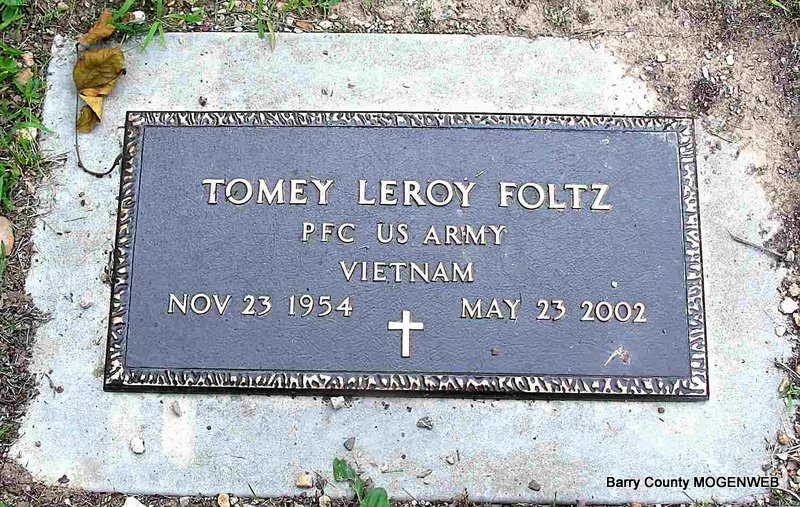 Inscription: "PFC US ARMY VIETNAM" - Research Note: Son of Tomey Lee Foltz and Faye Katherine Armstrong. He was an Army and Reserves veteran. He was employed for 11 years as a driller in the Oklahoma oil fields and was plant supervisor at Tyson Foods in Rogers, Arkansas, the past 10 years. He was a member of the First Southern Baptist Church in Golden. He married Debra Curley on June 21, 1978. | Monett Times May 24, 2002 Mary Homesley Photo Jack Fly |