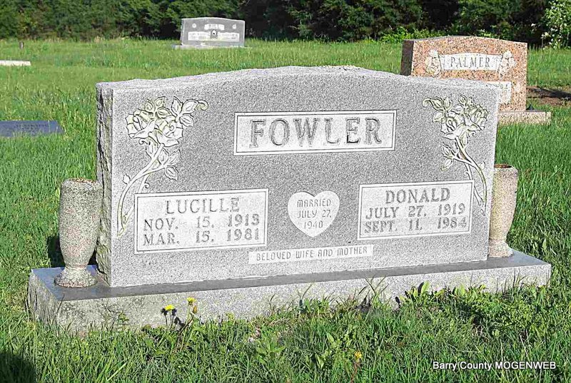 Mar. 15, 1981 | SSW: Donald - Inscription: "Married July 27, 1940" - Research Note: Daughter of William Clark White and Dora Runnels. Lucille White first married Wyman Lynn Teller on Jan. 16, 1934 in Jackson Co., MO. Donald E. Fowler married Lucille (White) Teller, age 26, on July 26, 1940 in Jackson Co., MO. | MO Marriage Records Census Phyllis Long Headstone Darla Ball Marbut Photo Jack Fly |