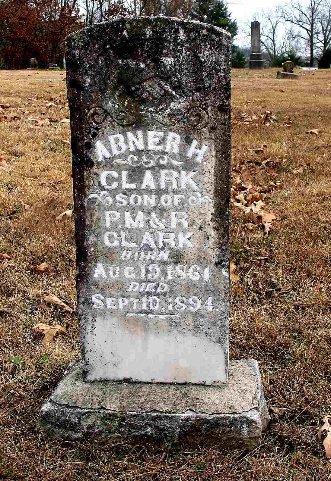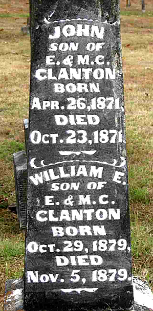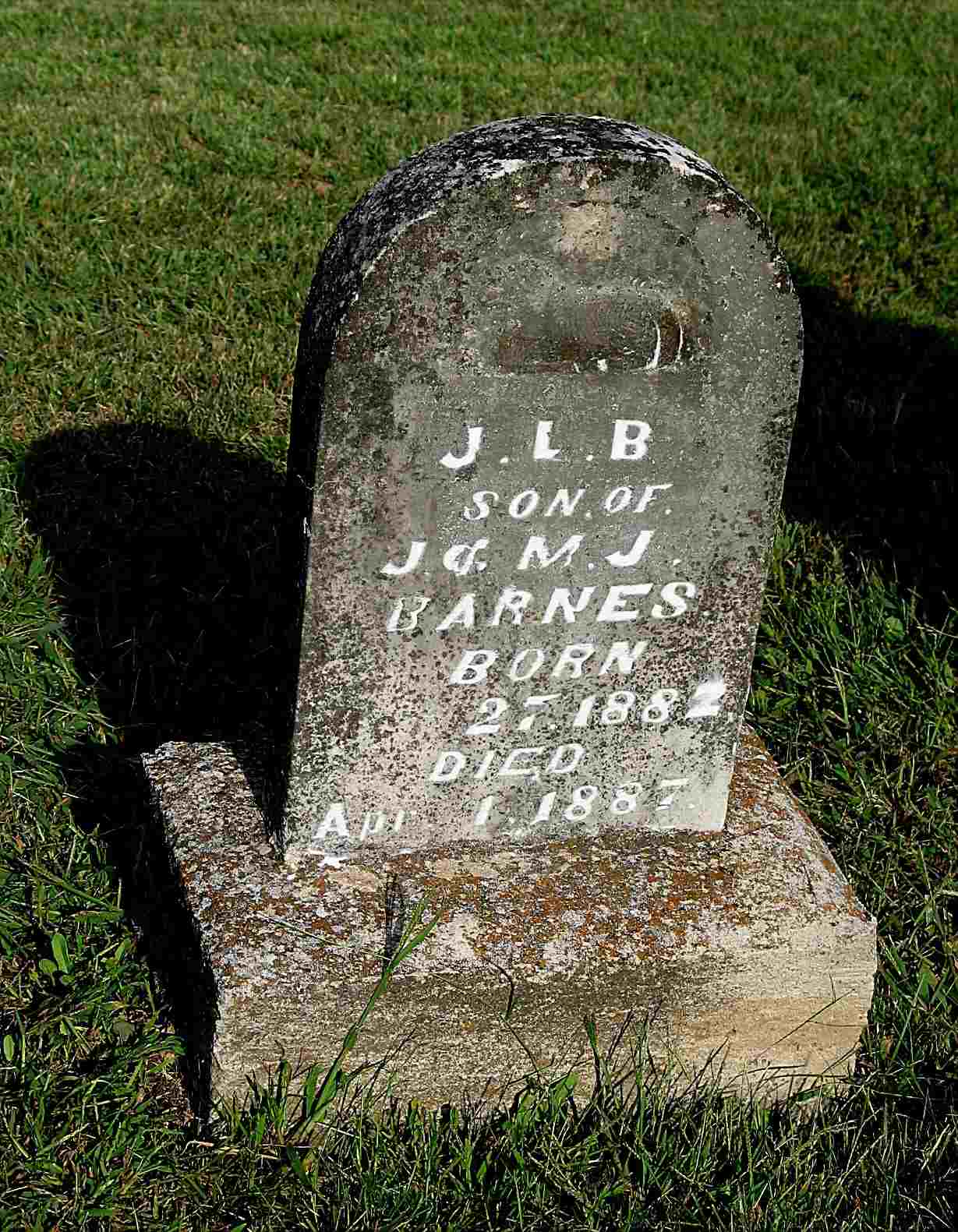 | BARNES, John Lorenzo Barnes aka J. L. B. | Oct. 27, 1882 | Apr. 1, 1887 | Inscription: "Son of J. and M. J. Barnes" - Research Note: Son of James Barnes and Mary Jane Smith. | Note Phyllis Long Headstone Darla Ball Marbut Photo Jack Fly |