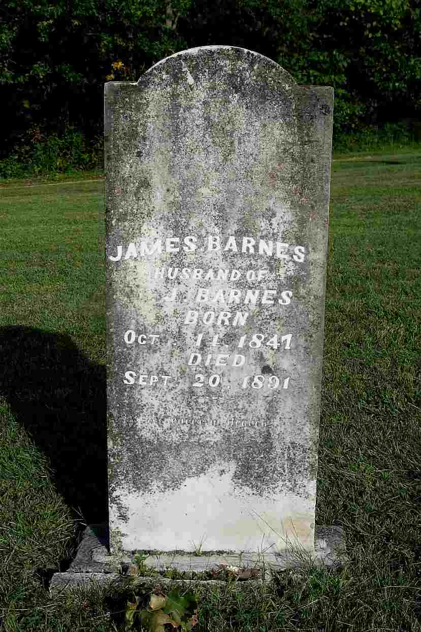 Sept. 20, 1891 | Inscription: "Husband of M. J. Barnes" - Research Note: Researchers say he was the son of James Barnes and Mary Magdalene Hembree. James Barnes married Sarah J. Smith on Nov. 12, 1866 in Barry Co., MO. James Barnes married Mary Jane Smith on Apr. 9, 1876 in Barry Co., MO. His second wife, Mary Jane Smith, died 1927, and is buried in the IOOF Cemetery, Eureka Springs, Carroll Co., AR. Civil War Veteran: Pvt. Co. I, 8th IL Cav., served from Mar. 10, 1864 to Oct. 10, 1865. - 1870 Census, Barry Co., MO - James Barnes, farmer, age 22, MO, white, male; Sarah J., age 27, MO, white, female; Mary J., age 2, MO, white, female; Jasper, age 1, MO, white, male - 1880 Census, Barry Co., MO - James Barnes, Self, Married, Male, White, 33, MO, Farmer; Mary J. Barnes, Wife, Married, Female, White, 24, MO, Keeps House, MO, KY; Mary Barnes, Dau, S, Female, White, 12, MO, At School, MO, MO; Thomas Barnes, Son, S, Male, White, 11, MO, Works on Farm, MO, MO; William Barnes, Son, S, Male, White, 4, MO, MO, MO; Matthew Barnes, Son, S, Male, White, 4 Months, MO, MO, MO (Born in January) | MO Marriage Records Census 1890 Vet Census Phyllis Long Headstone Darla Ball Marbut Photo Jack Fly |