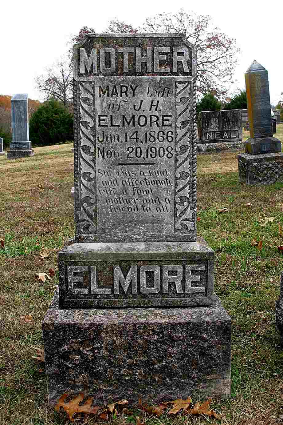 | ELMORE, Mary (SPARKS) | Jan. 14, 1866 | Nov. 20, 1908 | Inscription: "Wife of John H. Elmore" - Research Note: She was a daughter of Jesse Samuel Sparks and Sarah Ann Logan. Mary A. Sparks married John H. Elmore on Feb. 20, 1886 in Barry Co., MO. - Cassville Democrat, November 28, 1908 - We are sorry to chronicle the death of Mrs. John Elmore at her home near Eagle Rock, Nov. 20, from continued sickness, aged about 32 years. She was a daughter of the late Jesse Sparks of near Golden. She left a husband and two children to mourn her loss. She was a member of the Christian Church and enjoyed the respect and confidence of all her acquaintances. The remains were laid to rest in Viney Cemetery. Mr. Elmore's many old friends in Cassville and Washburn will heartily sympathize with him, in his great loss. | Online Obit MO Marriage Records Census Phyllis Long Headstone Darla Ball Marbut Photo Jack Fly |