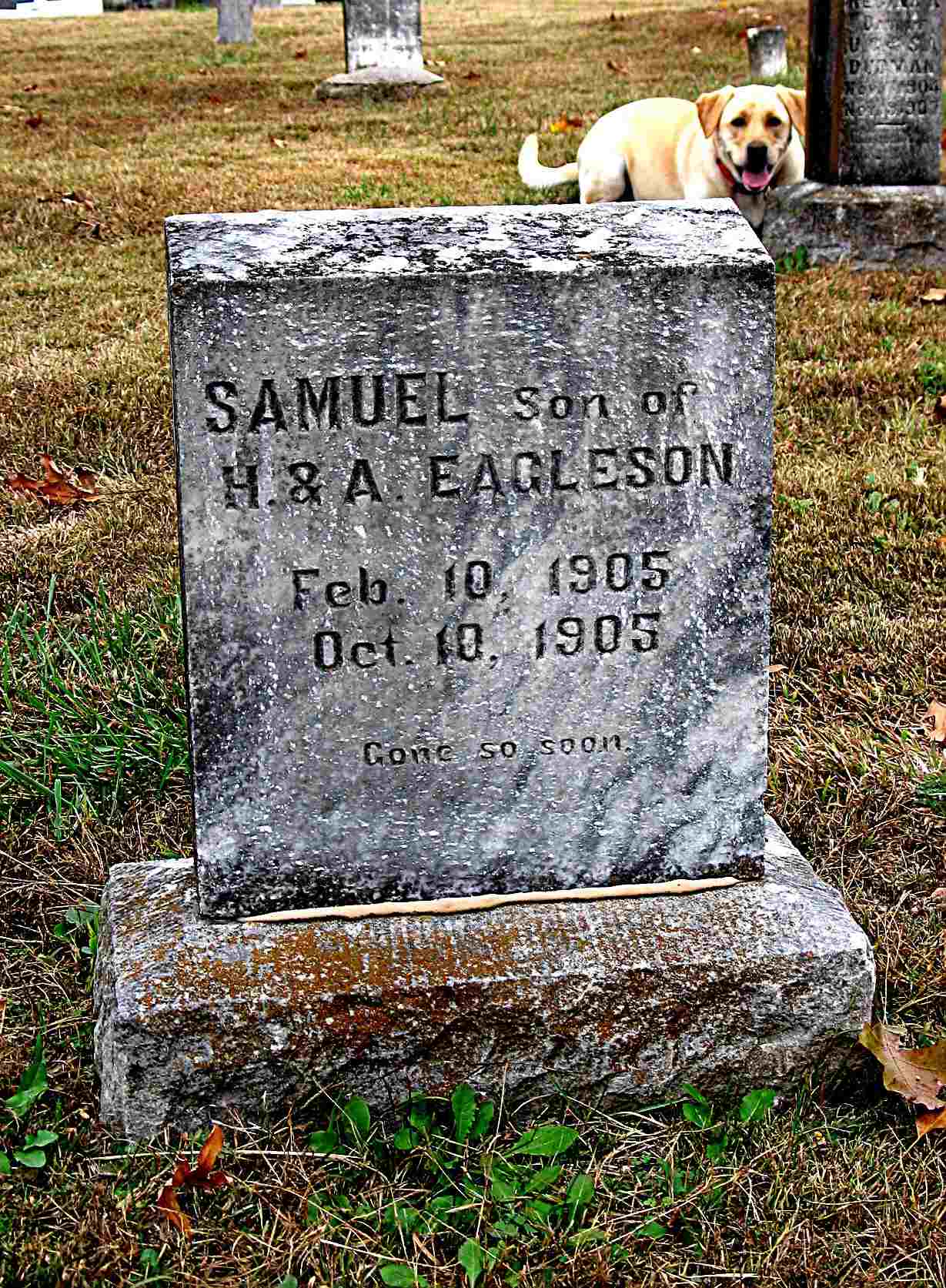 | EAGLESON, Samuel | Feb. 10, 1905 | Oct. 10, 1905 | Inscription: "Son of H. and A. Eagleson" - Research Note: Son of Herbert Eagleson and Sarah Anna Lee. | Note Phyllis Long Headstone Darla Ball Marbut Photo Jack Fly |