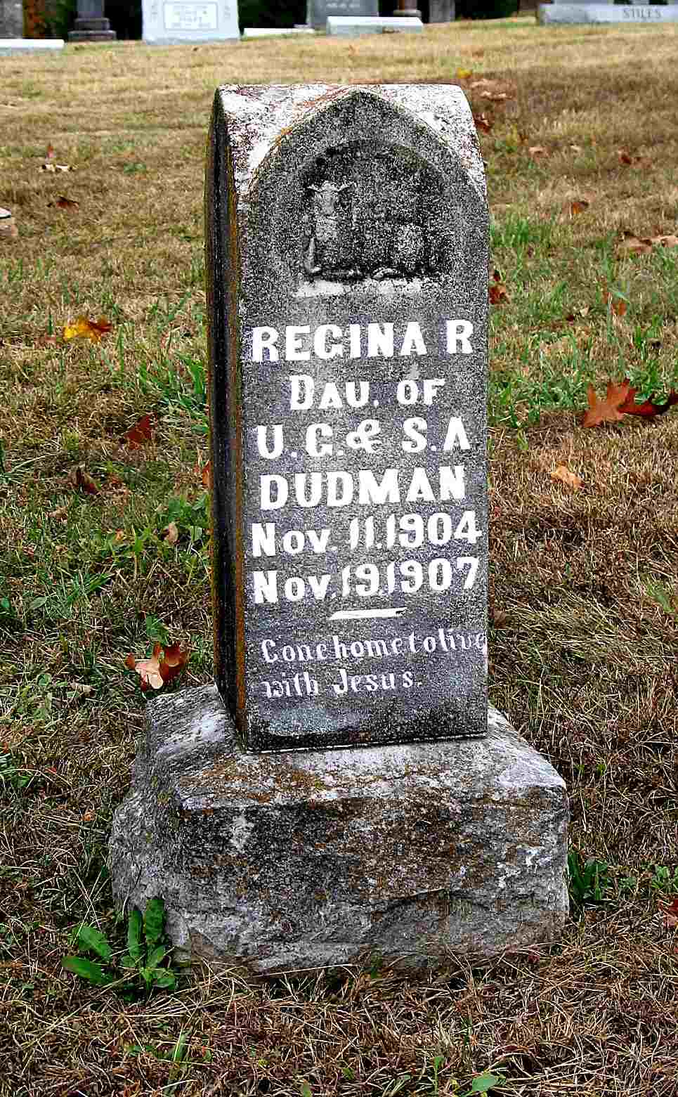 | DUDMAN, Regina K. | Nov. 11, 1904 | Nov. 19, 1907 | Inscription: "Dau. of V. C. and S. A." | Headstone Darla Ball Marbut Photo Jack Fly |