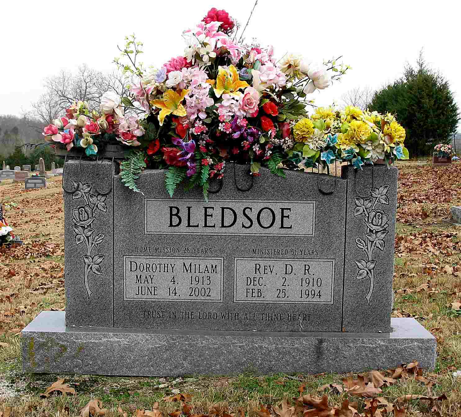 June 14, 2002 | SSW: Rev. D. R. - Inscription: "Home Mission 28 Years" - Research Note: Third wife of Delbert Richard Bledsoe. Daughter of Gus E. Milam and Etta J. Spake. | SS Claims Index Phyllis Long Headstone Darla Ball Marbut Photo Jack Fly |