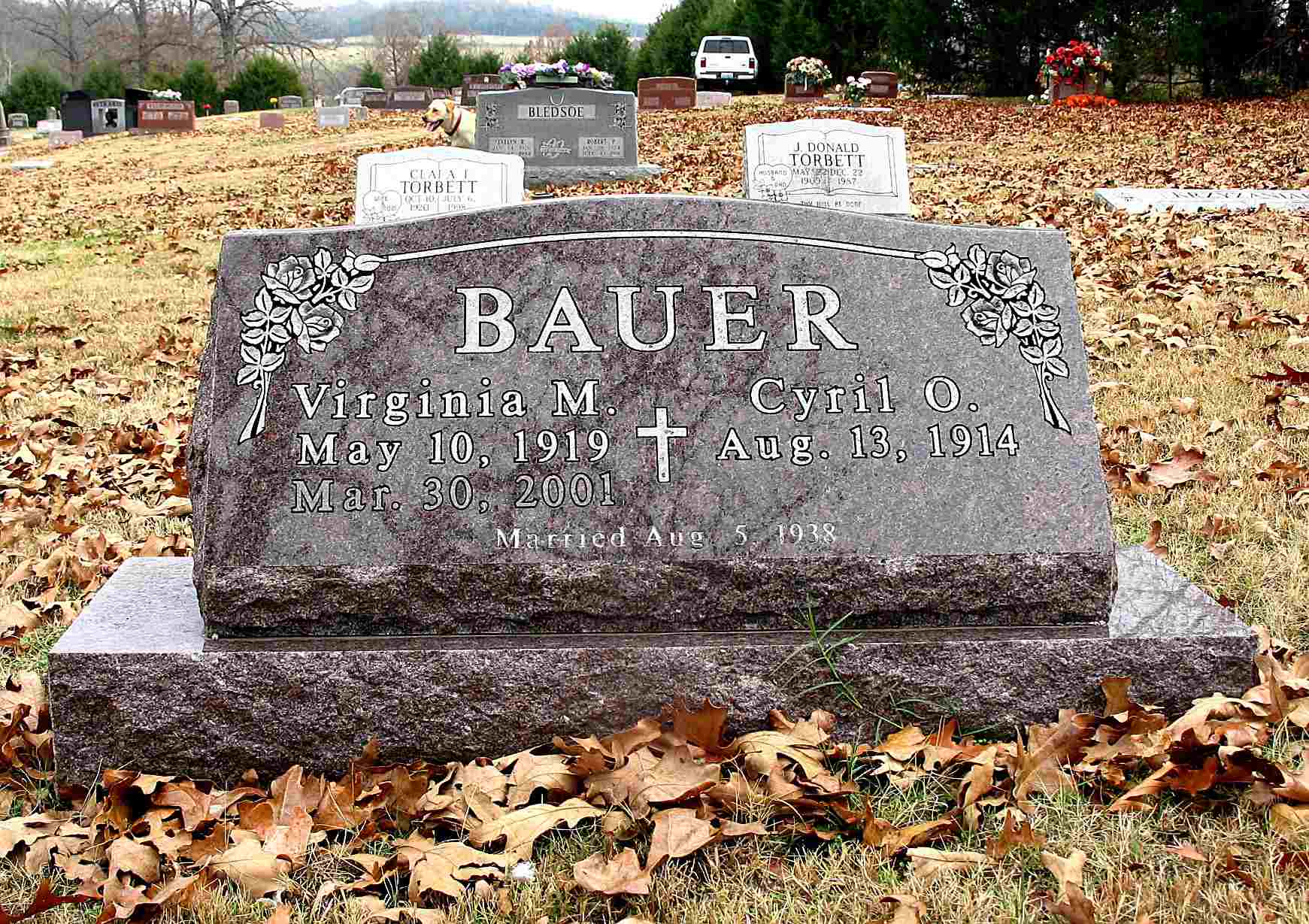 SSW: Cyril O. - Inscription: "Married Aug 5, 1938" - Research Note: Virginia May Bauer, age 81, of Golden, died March 30, 2001, at her home. She was born May 10, 1919, in Sycamore, Illinois, and was a daughter of Harry and Anna (Nord) Cornwall. She married Cyril O. Bauer on August 5, 1938, in Sycamore, Illinois. | Monett Times April 2, 2001 Mary Homesley |