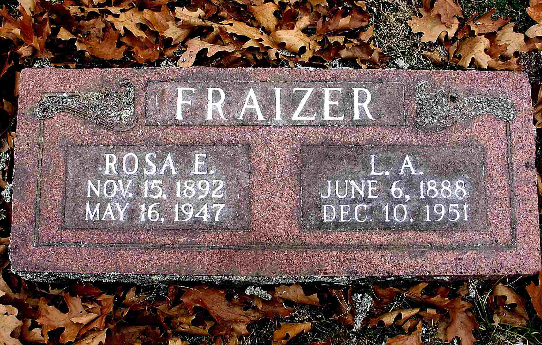 SSW: Lawrence A. - Research Note: Her death certificate reads that her father was Matthew Hill, born MO, and her mother Georgia Ann Ridinger, place of birth was unknown to the informant, Lawrence Frazier, Golden, MO. Her husband was Lawrence Frazier and he was 58 years old. She was age 54 years, 6 months and 1 day old when she died. It reads she was born in 1882, not 1892 like the stone reads. The first transcription had her name as Rose E. and not Rosa E. as the stone and the death certificate both read. | Headstone Darla Ball Marbut Photo Jack Fly Death Certificate Donna Cooper |