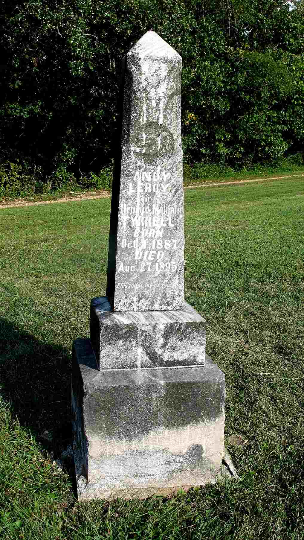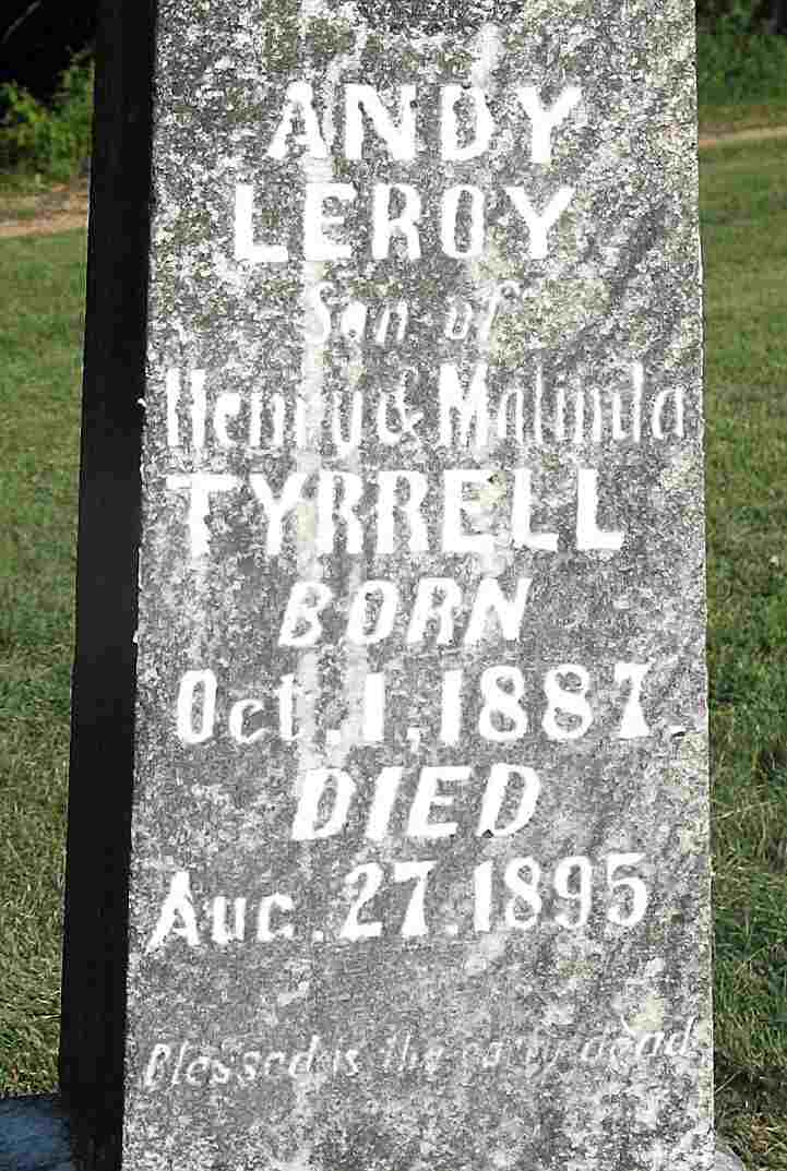 | TYRRELL, Andy Leroy | Oct. 1, 1887 | Aug. 27, 1895 | Inscription: "Son of Henry and Melinda Tyrrell" - Another Photo | Headstone Darla Ball Marbut Photo Jack Fly |