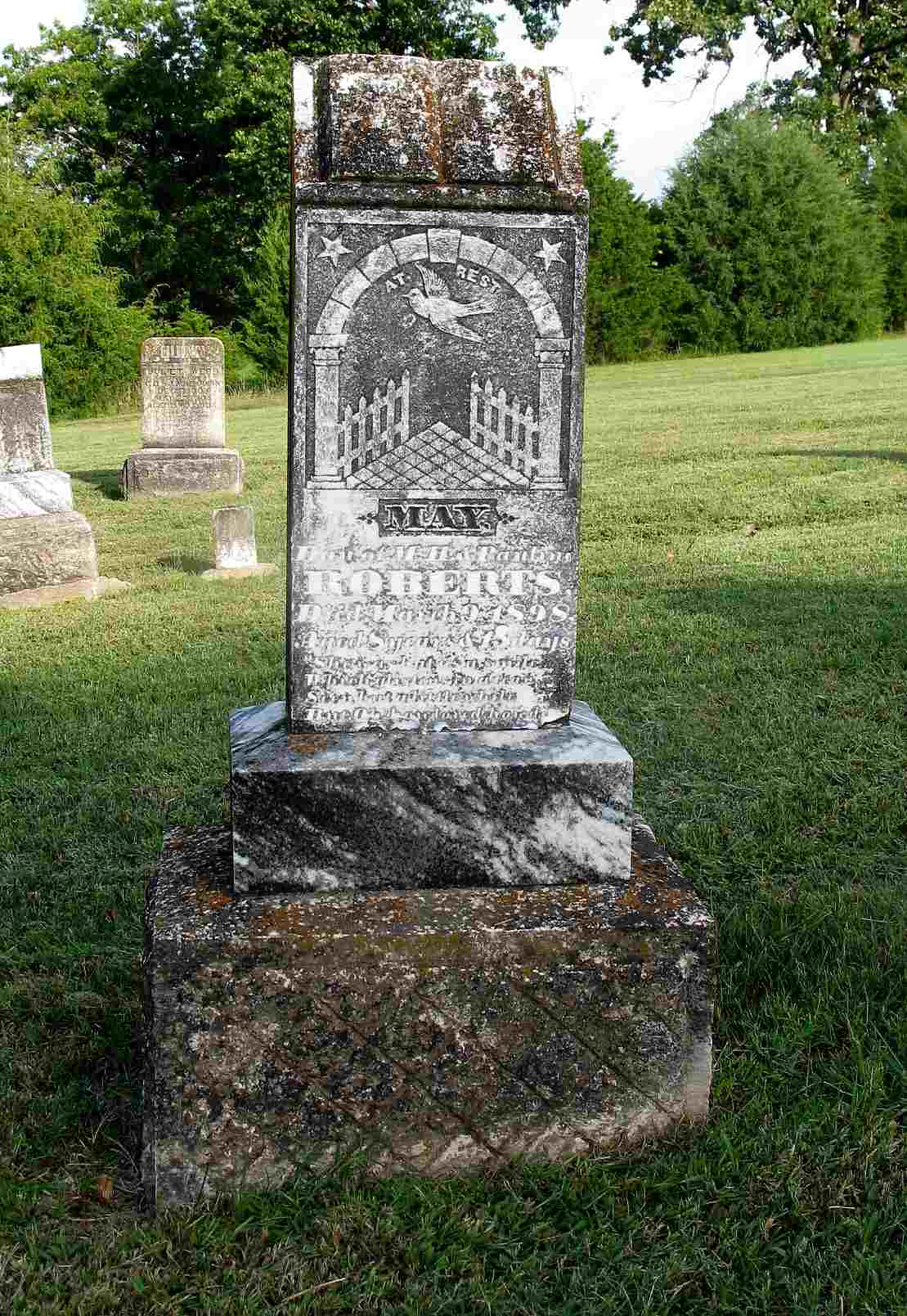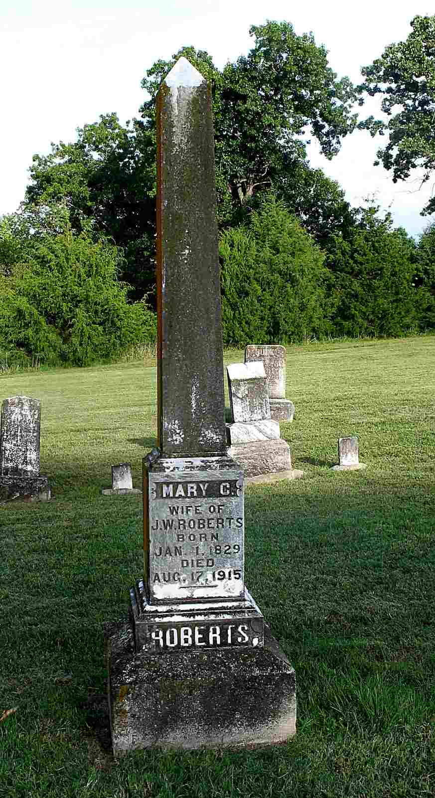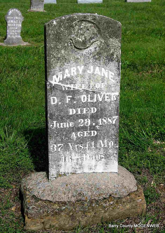June 29, 1887 | Inscription: "Wife of D. F. Oliver - Aged 37 Yrs 11 Mo 26 Days" - Research Note: Daughter of William Nelson Martin and (2nd wife) Rebecca Parsley. Mary J. Switser married David F. Oliver on Sept. 25, 1873 in Jasper Co., MO. | Census MO Marriage Records Phyllis Long Headstone Darla Ball Marbut Photo Stone Repair Jack Fly |