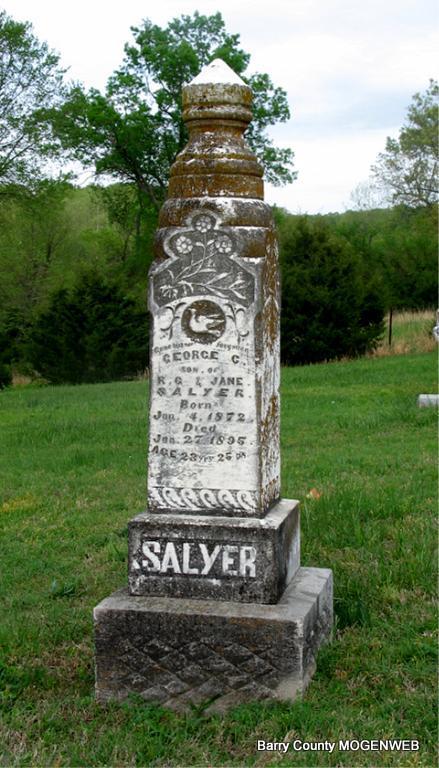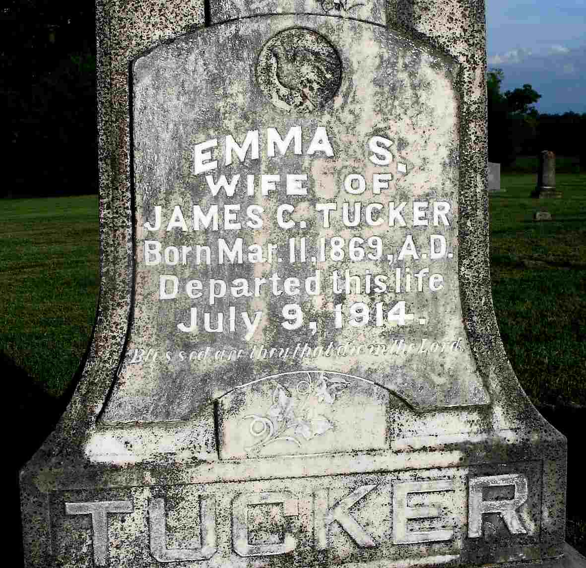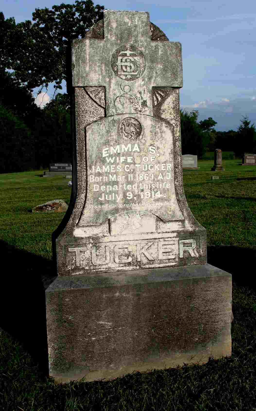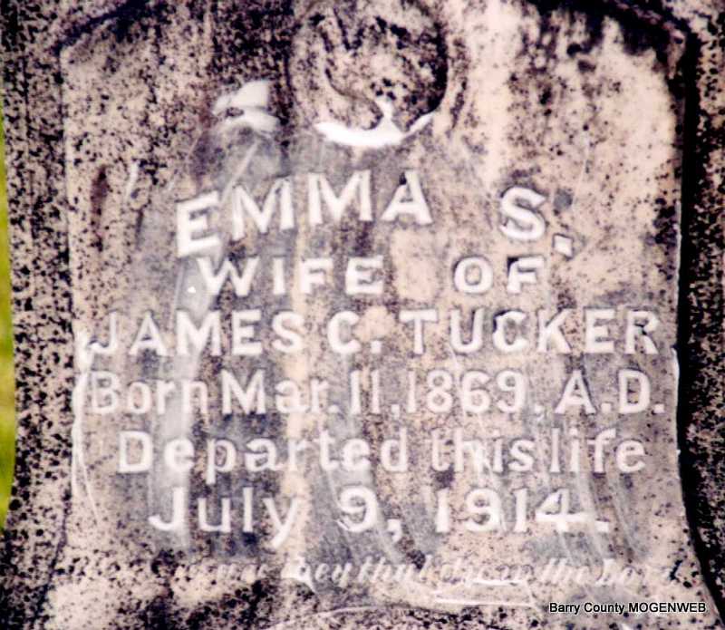 Inscription: " Wife of James C. Tucker" -Research Note: She was a daughter of Rufus Garland and Martha Jane (Perry) Salyer. Her death certificate reads she was buried in Spring Grove Cemetery. It gives her mother as Jane Webb Perry and lists both parents born in KY. G. D. Quinn, Golden, MO, was the informant. - July 9, 1914, Thursday, Cassville Republican - Golden News: The people around Golden were sorry to hear of the death of Mrs. James Tucker. She departed this life, Thursday, July 9, at the age of 45 years. She was a daughter of R. G. Salyer and a sister of Mrs. G. D. Quinn. Mrs. Tucker leaves a husband and five children, besides a number of other relatives and friends to mourn her death. The body of the deceased was laid to rest in the Viney Cemetery, Friday, July 10. - July 16, 1914, Thursday, Cassville Republican - Mother Dead: Mrs. Emma S. Tucker passed peacefully away, Thursday, July 9, at 1:15 p. m., at her home near Golden. Mrs. Tucker had been afflicted for several months of Bright's disease. The first of last week her illness became more acute and the disease made its victory inevitable. Mrs. Tucker was a daughter of R. G. Salyer of this city and was born near Salyersville, Ky., March 1, 1869. She had lived in the vicinity of Golden for 26 years, where she enjoyed the esteem and confidence of her acquaintance. In 1892 she was married to J. C. Tucker, who survives. She also leaves five children, Glenn, Bee, Blanche, Garland, and Ralph. Besides a father she also leaves a sister, Mrs. Quinn, of Golden, and a brother, Arthur, of this city. The funeral services, conducted by Rev. E. W. Love, were held at the family home, Friday at 1 p.m. and burial was made in the Spring Grove Cemetery north of Golden. Mrs. Tucker was a member of the Christian Church, and her influence was always for good. She loved her home and was devoted to her family. Her community has lost a good citizen and the family a loving, devoted and self sacrificing mother. - Another Photo - Another Photo | Photo Darla Ball Marbut Online Obit Death Certificate Donna Cooper Photo Jack Fly |